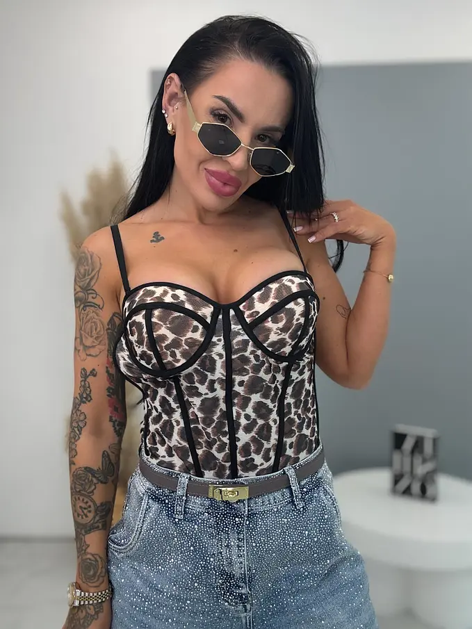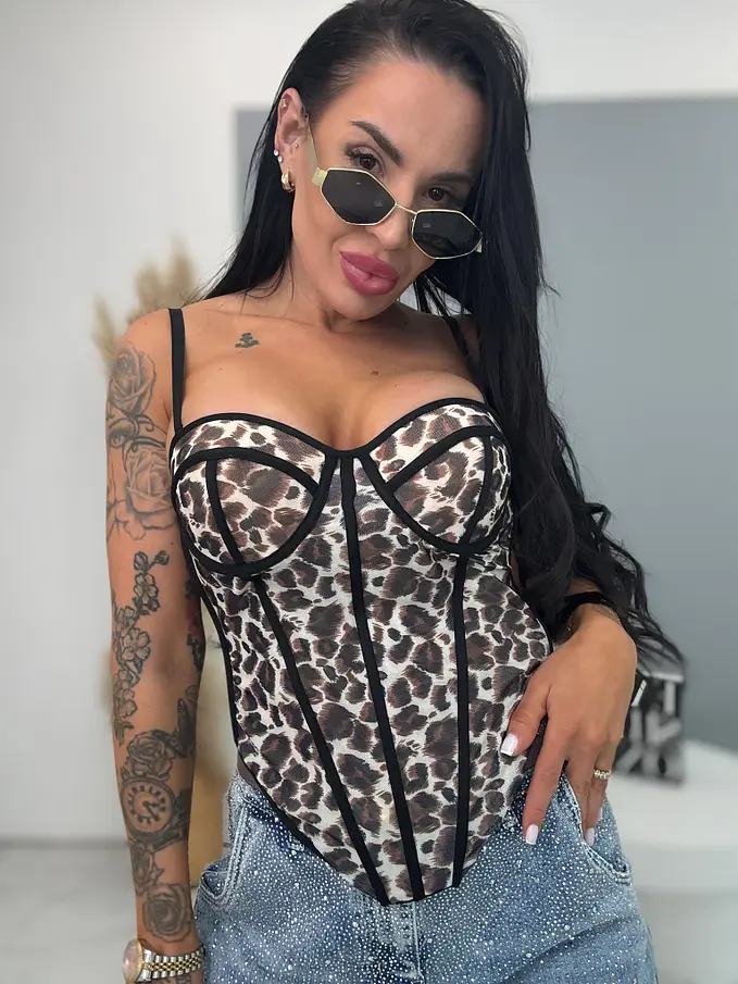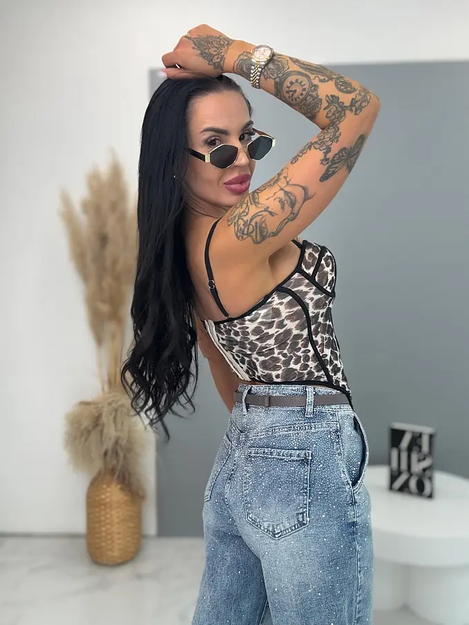 Modelka meria 164 cm a váži 57 kg. Má na sebe veľkosť S/M.