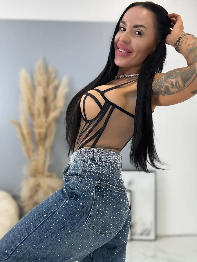Modelka meria 164 cm a váži 57 kg. Má na sebe veľkosť S/M.