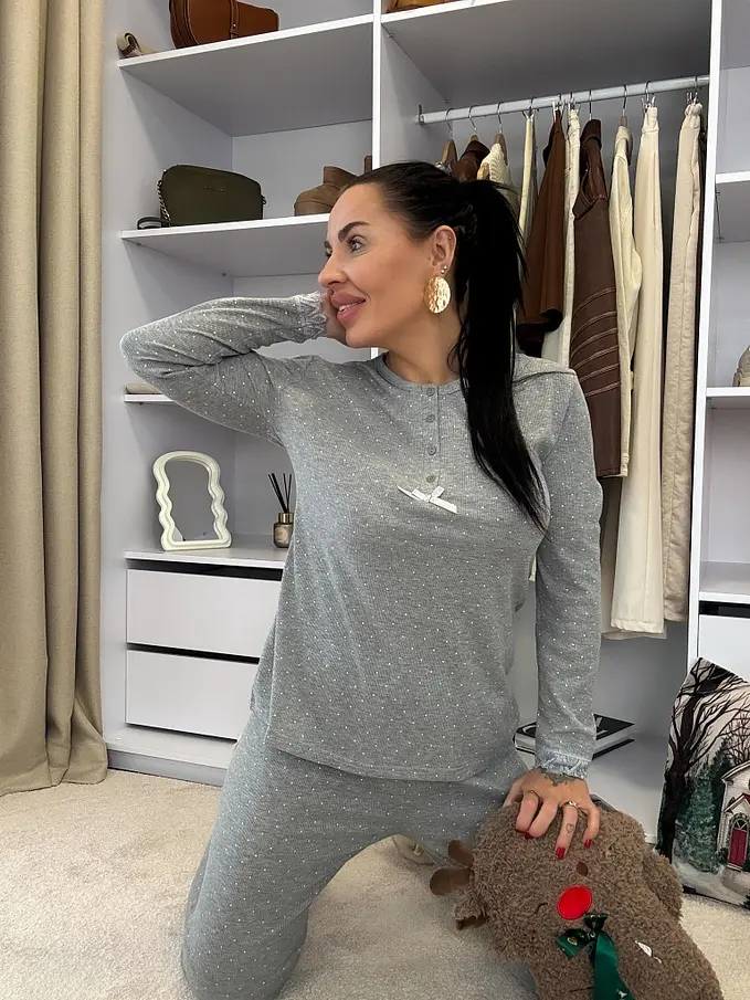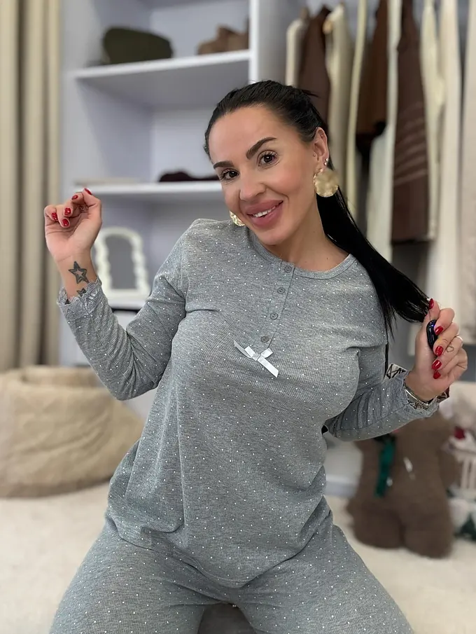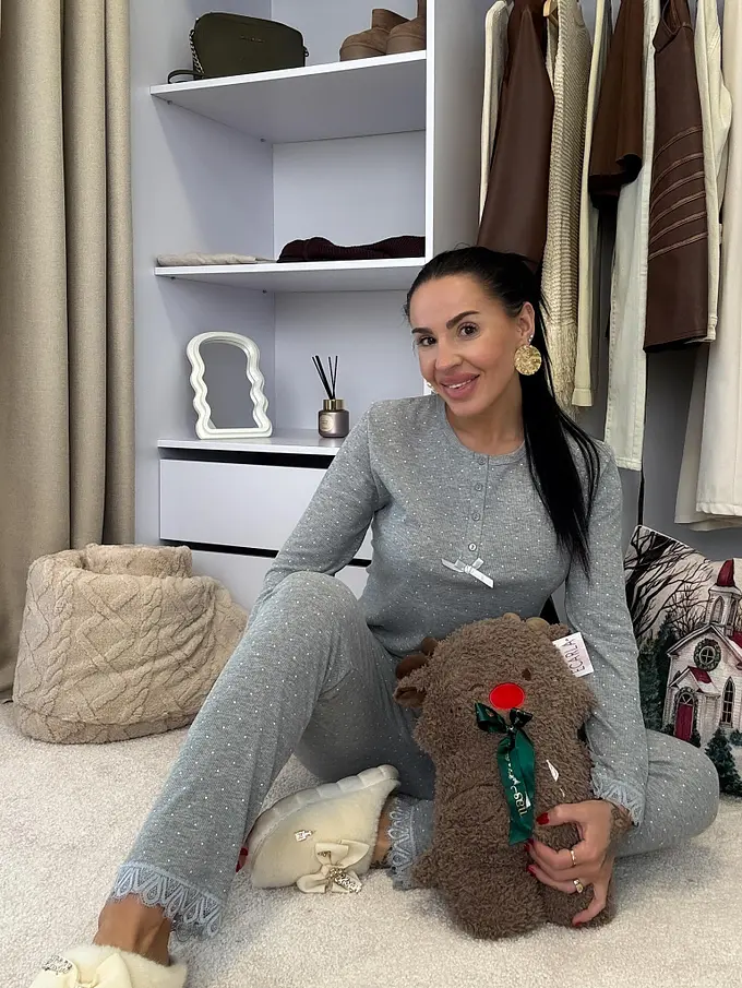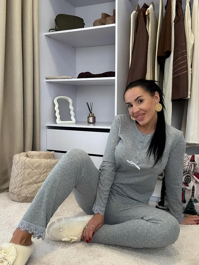 Rebrované pyžamo s čipkovým lemom. Tenká látka. Nohavice majú gumený pás. Horná časť s gombíkovou légou.