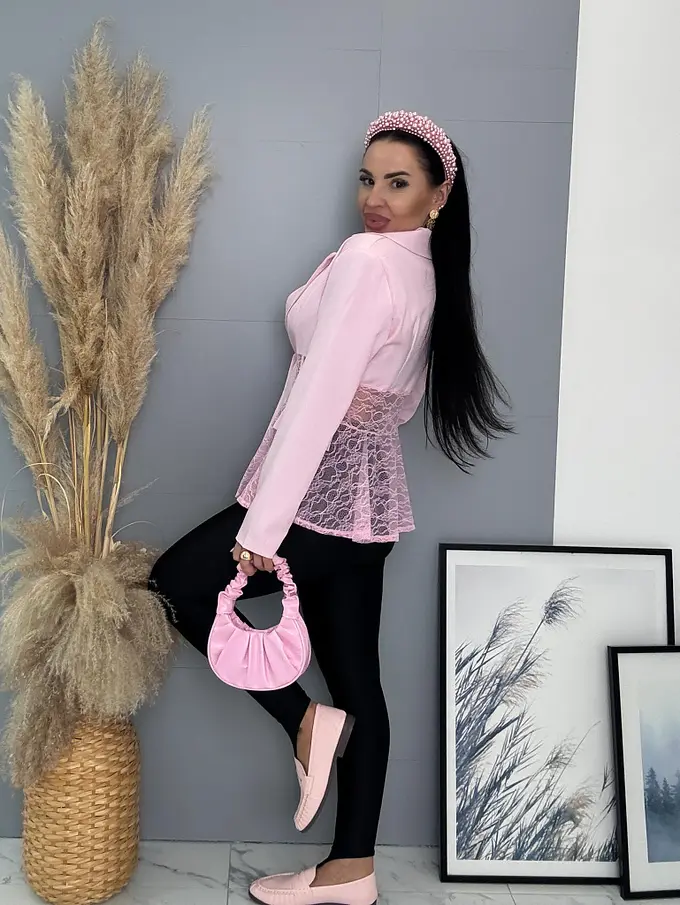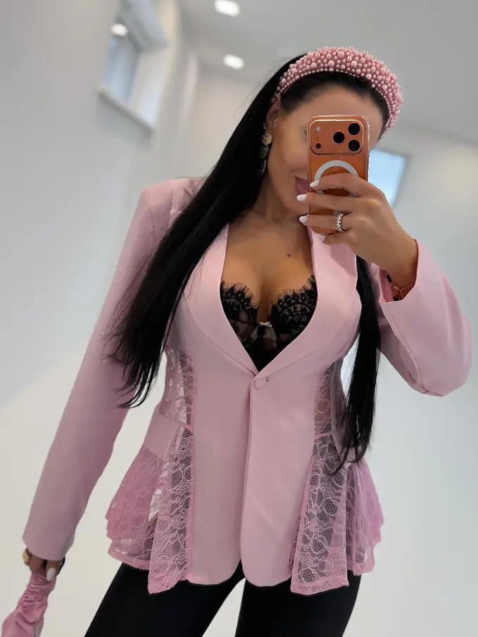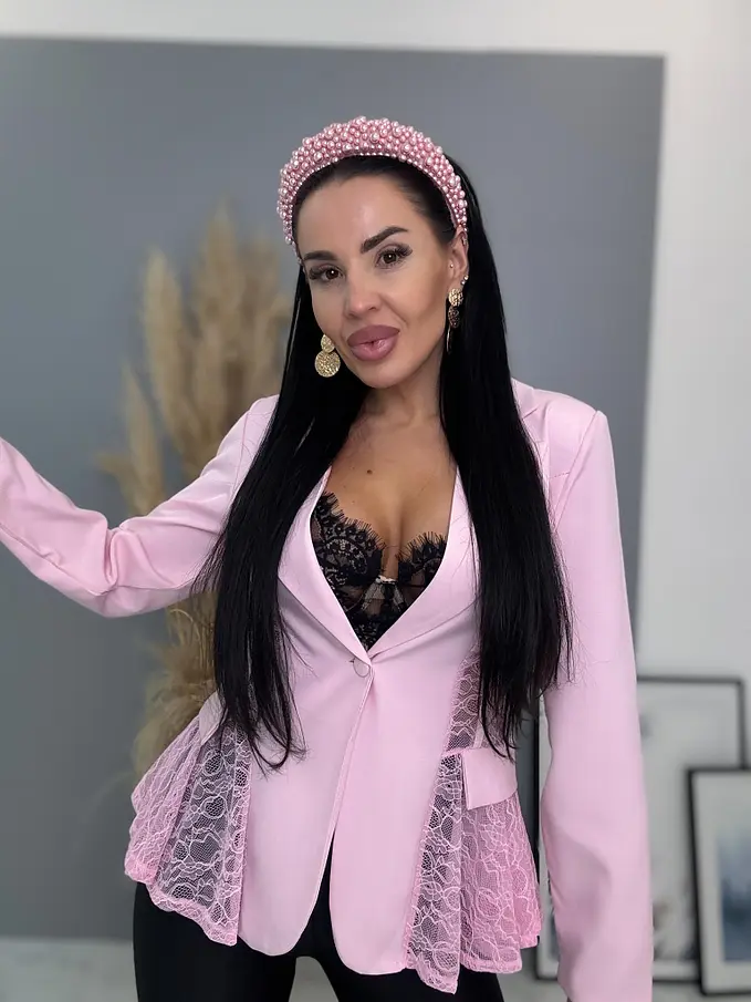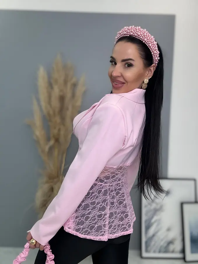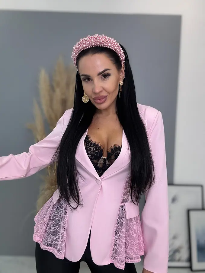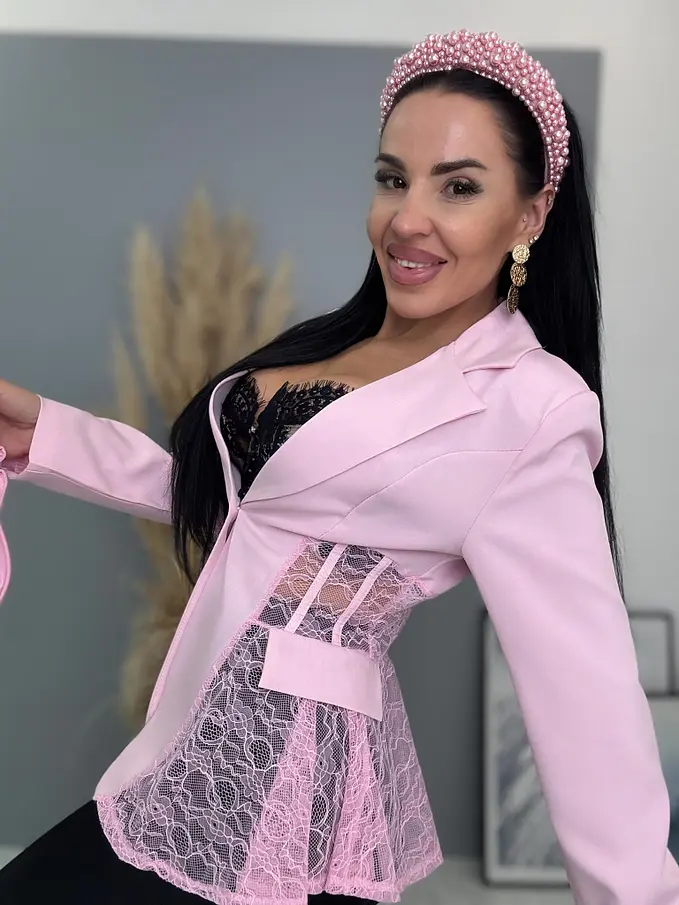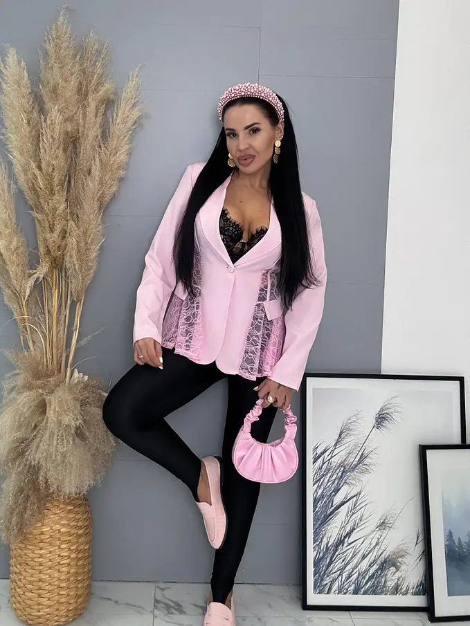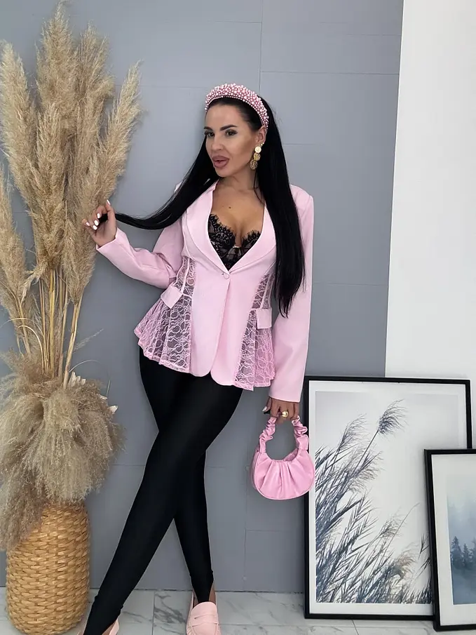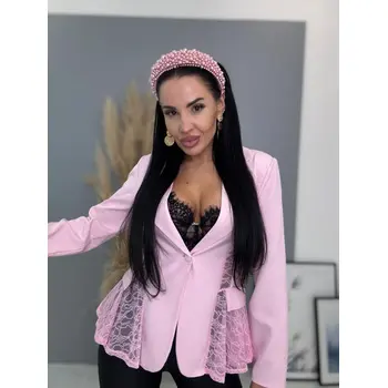 Dámske sako z príjemného materiálu. Materiál nie je elastický. Sako sa zapína na gombík. Má vypchávky v oblasti ramien. Priehľadnými čipkovými vsadkami. Sako je podšité.