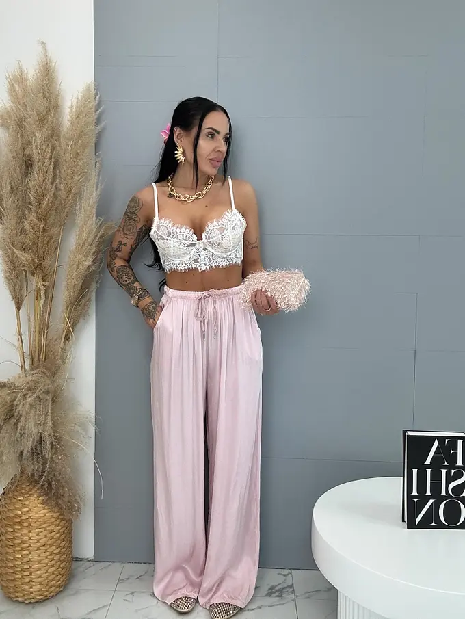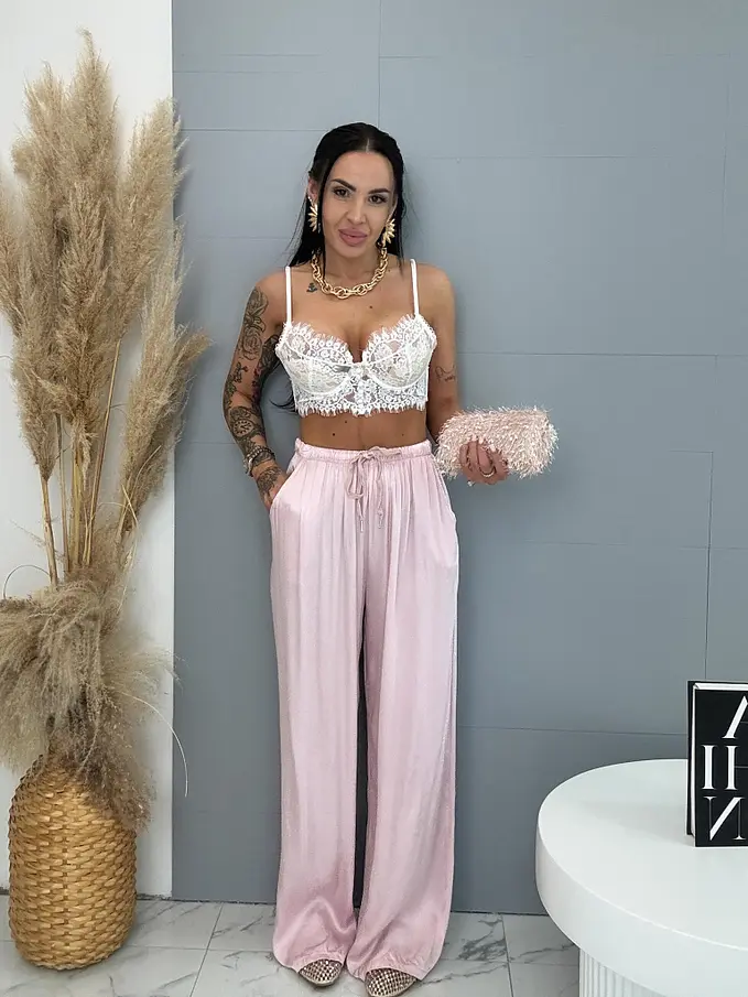 Ľahké saténové nohavice z kvalitného materiálu v modernom širokom strihu. Model so širokými nohavicami, vysokým pásom, elastickým pásom pre pohodlie a praktickými bočnými vreckami.