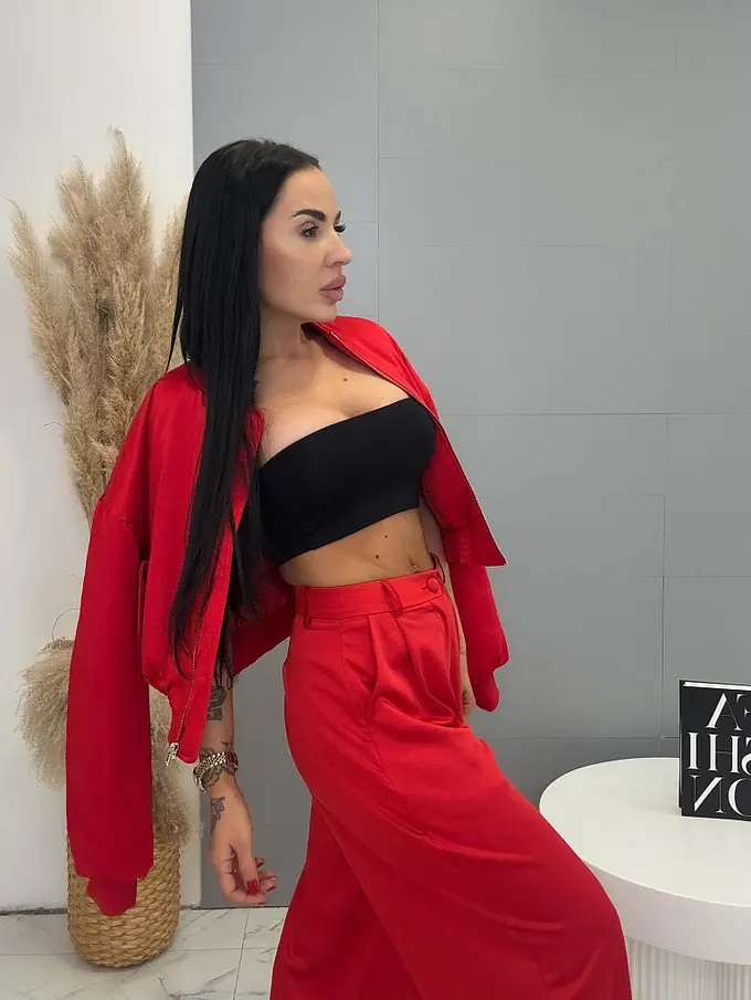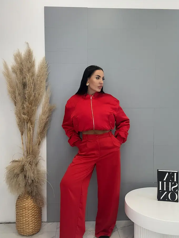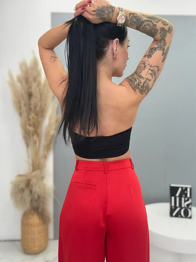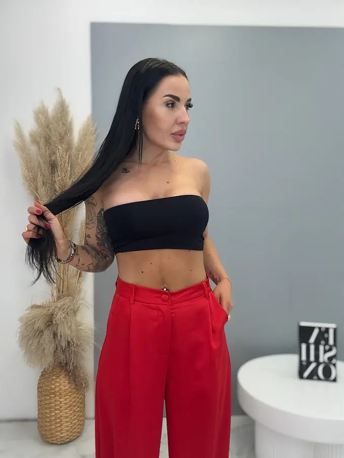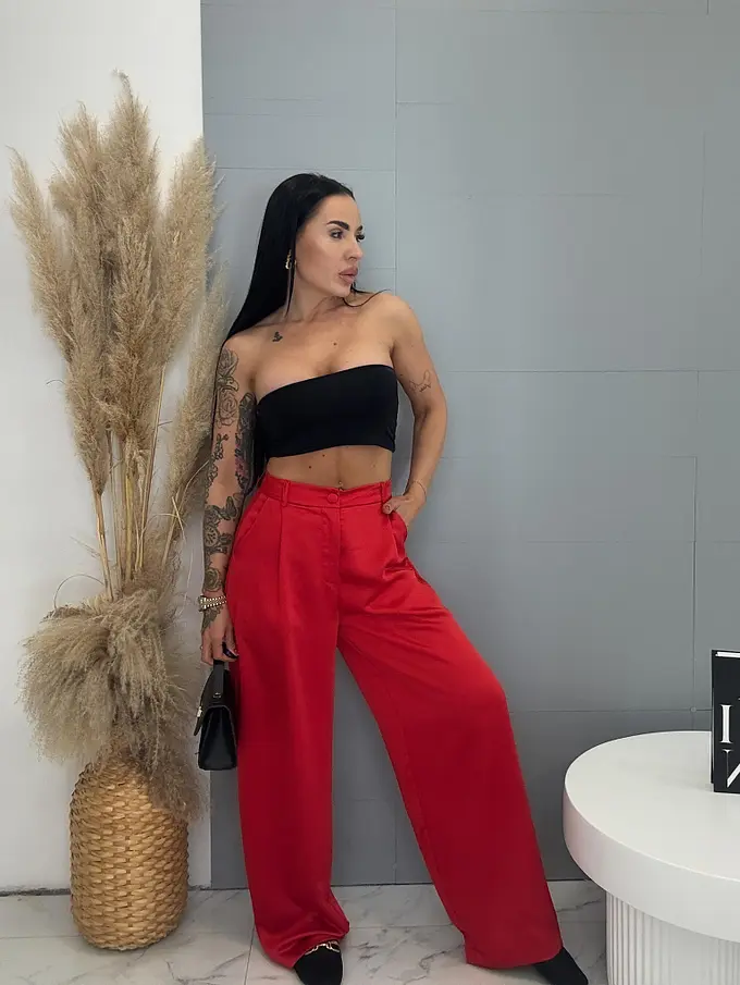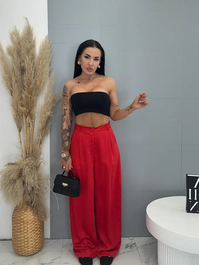 Ponúkame elegantné dámske nohavice, tento model spája luxusný štýl s pohodlným nosením — materiál je príjemný na dotyk a jemne sa leskne, čo zvyšuje prestíž každého outfitu. Široké nohavice a vysoký pás opticky predlžujú postavu, zatiaľ čo dekoratívne záhyby pridávajú originalitu a ľahkosť. Praktickými bočnými vreckami. Ideálna voľba do kancelárie, na špeciálne udalosti aj každodenné nosenie.