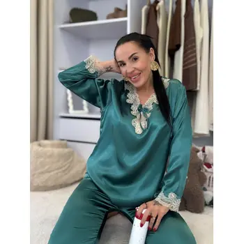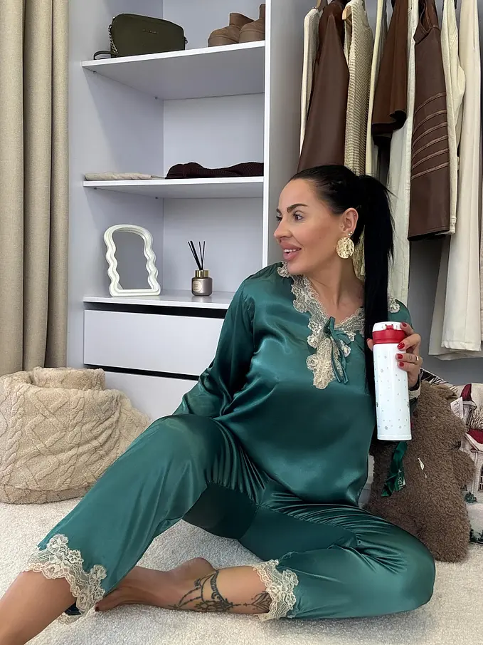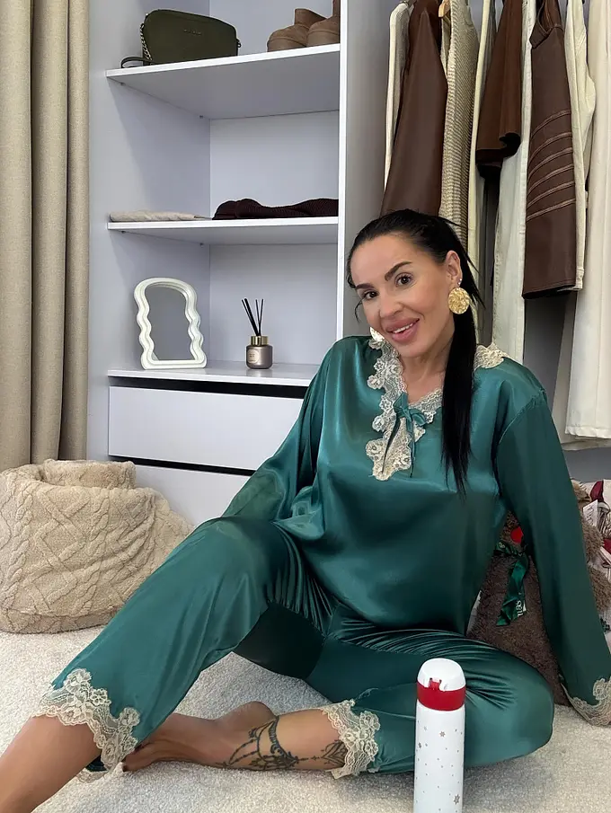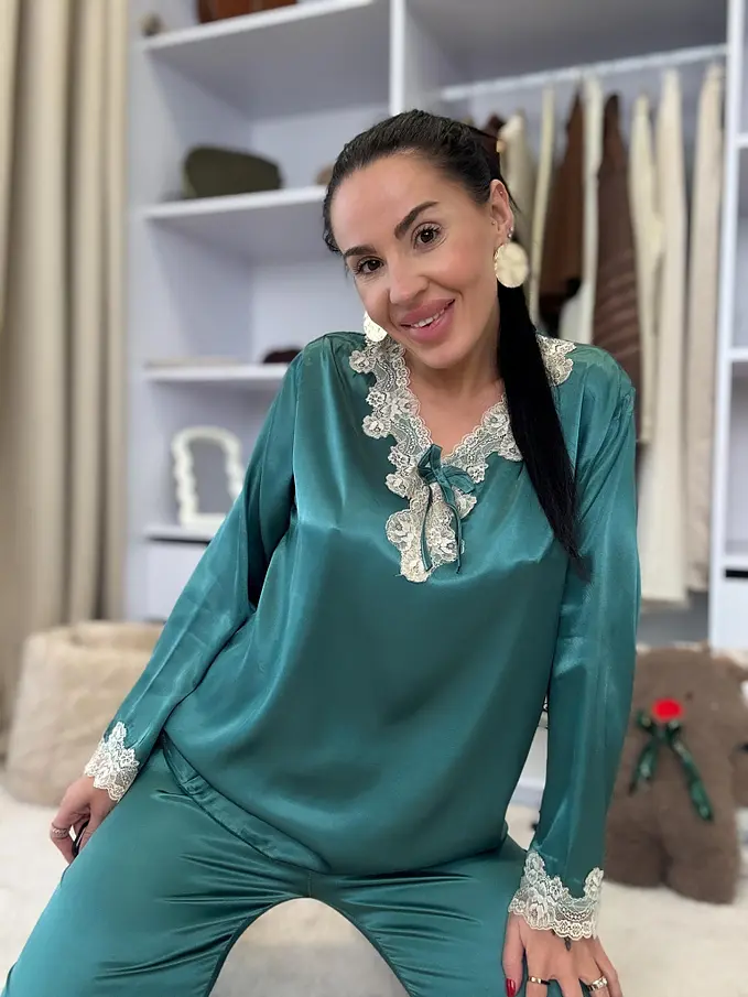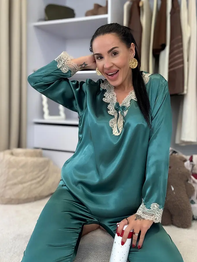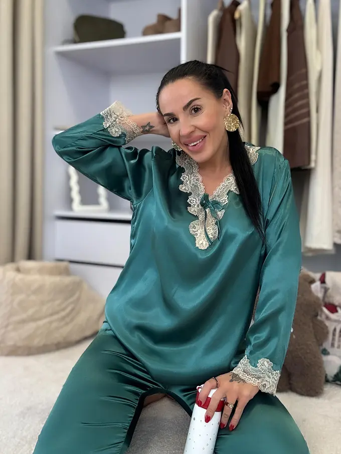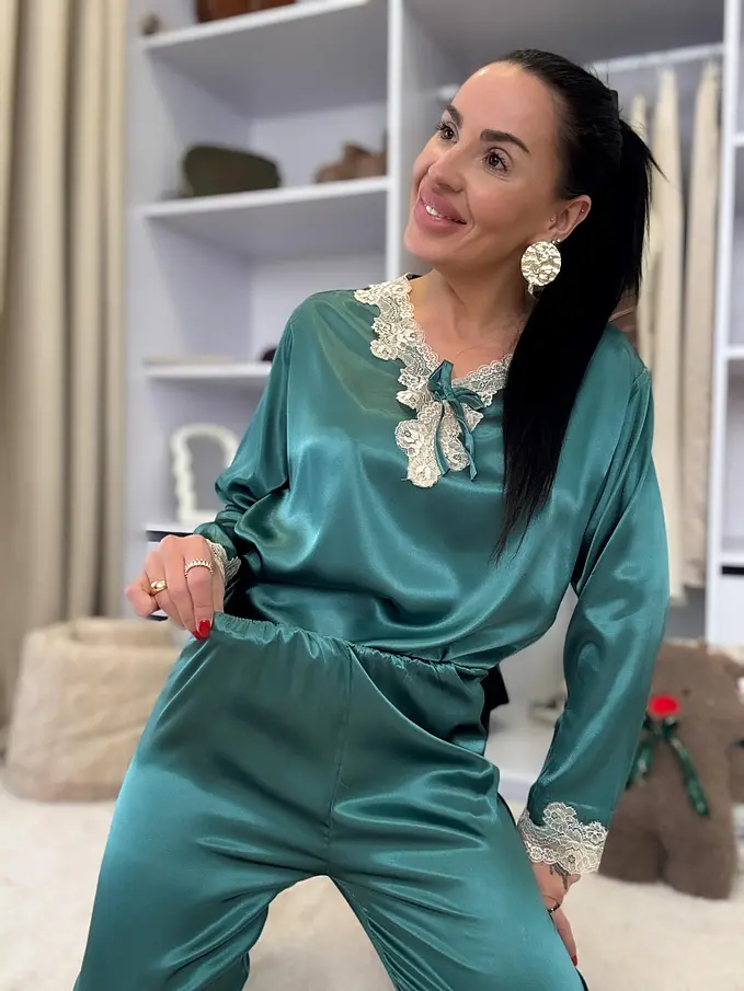 Saténové pyžamo s čipkovým lemom. Látka nie je elastická. Nohavice majú gumený pás. Horná časť je zdobená čipkou.