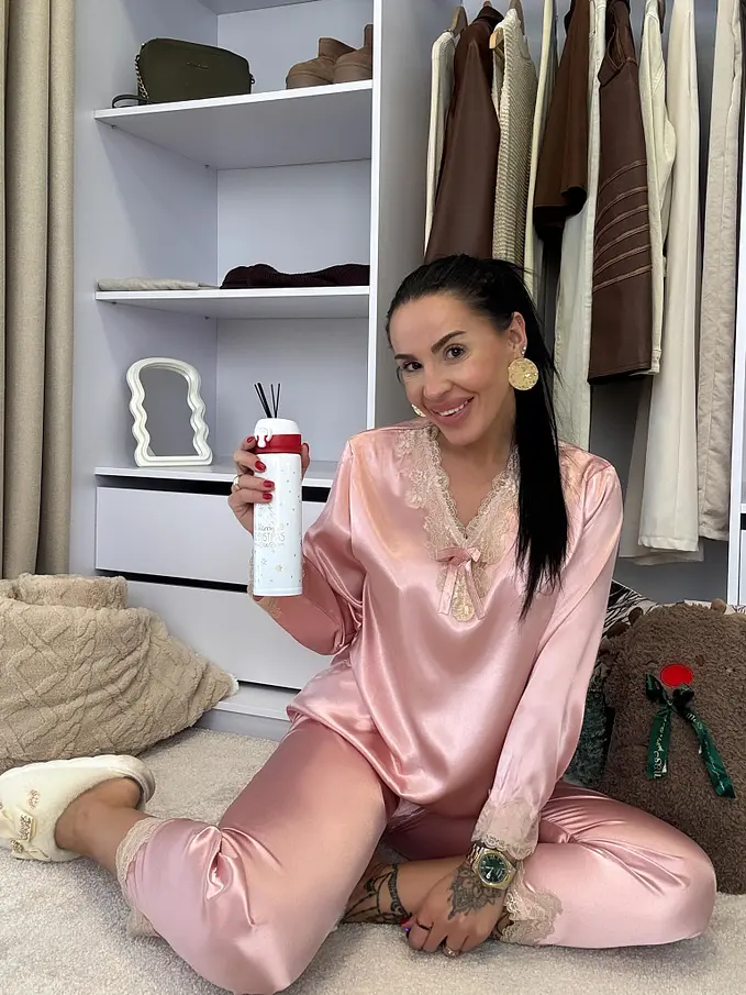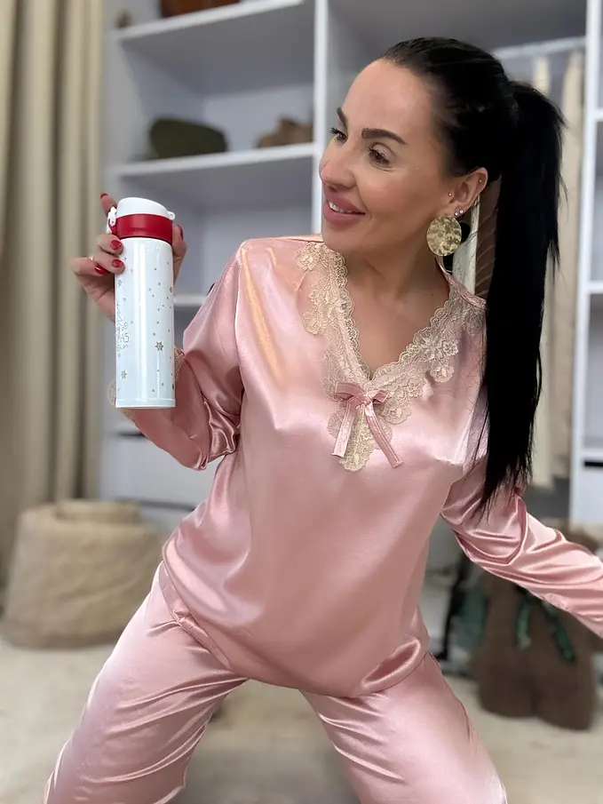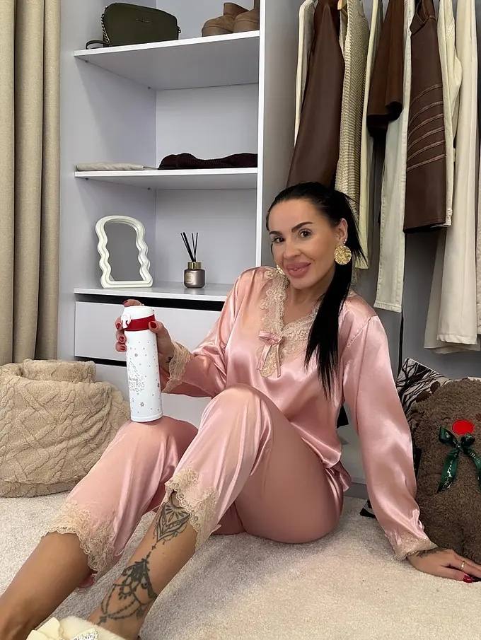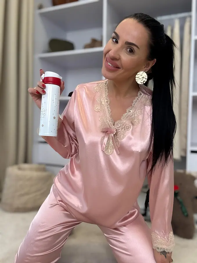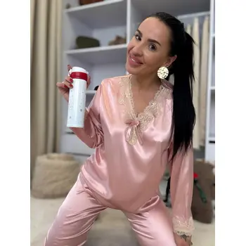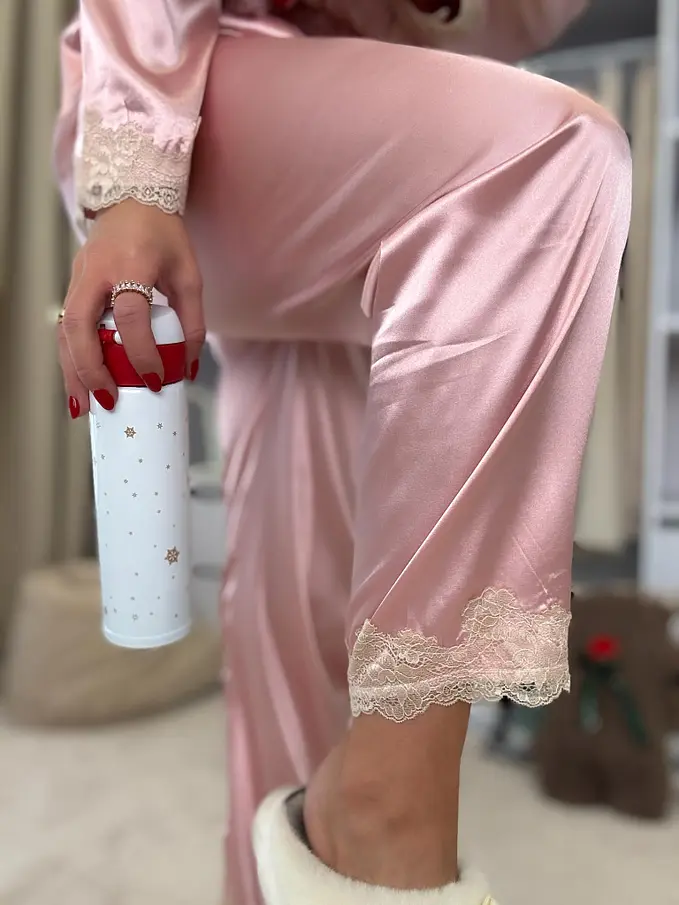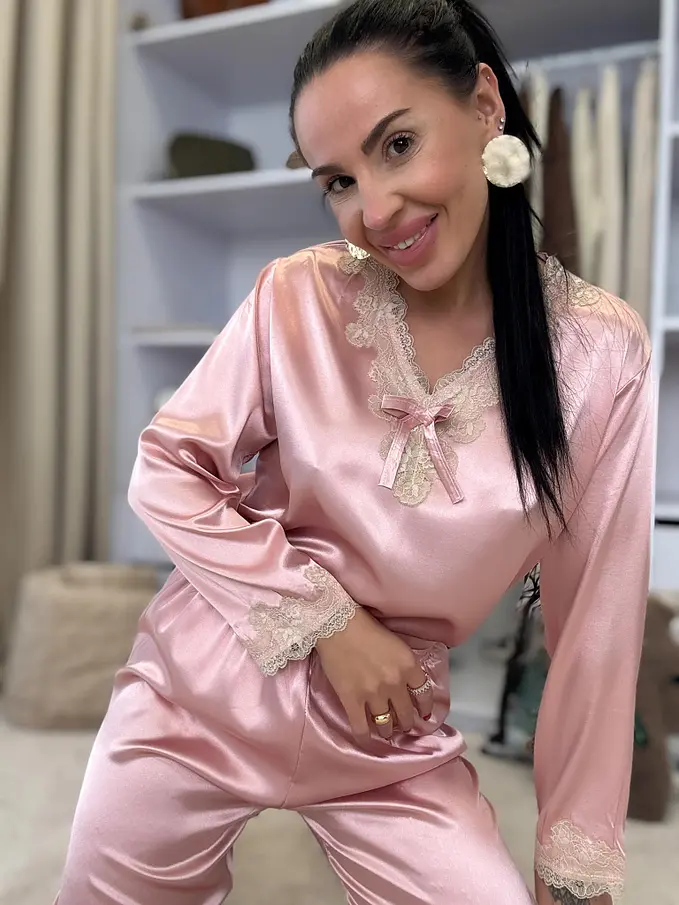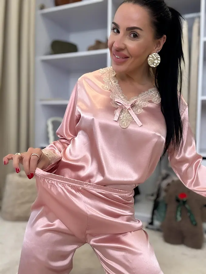 Saténové pyžamo s čipkovým lemom. Látka nie je elastická. Nohavice majú gumený pás. Horná časť je zdobená čipkou.