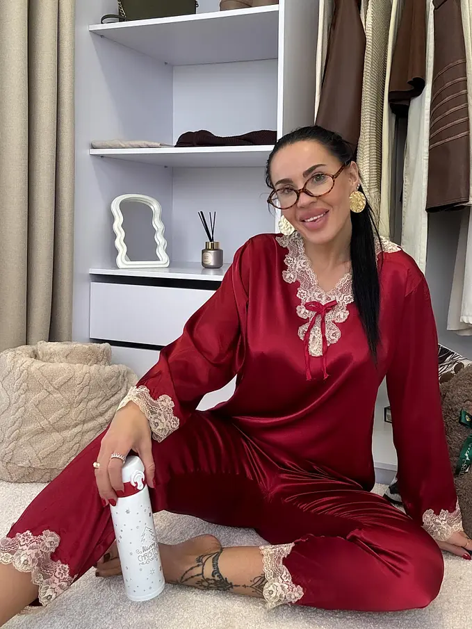 Saténové pyžamo s čipkovým lemom. Látka nie je elastická. Nohavice majú gumený pás. Horná časť je zdobená čipkou.