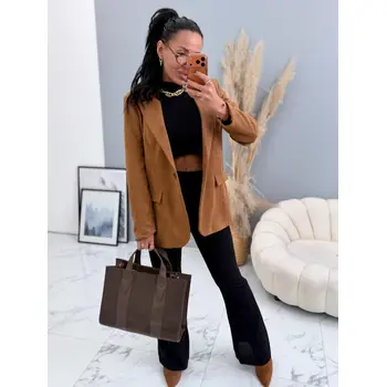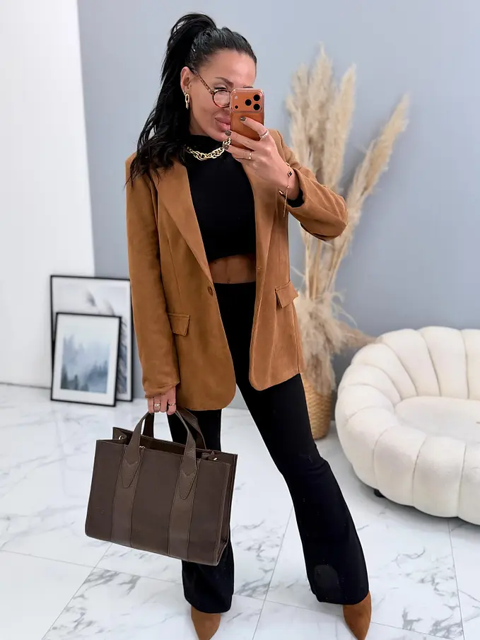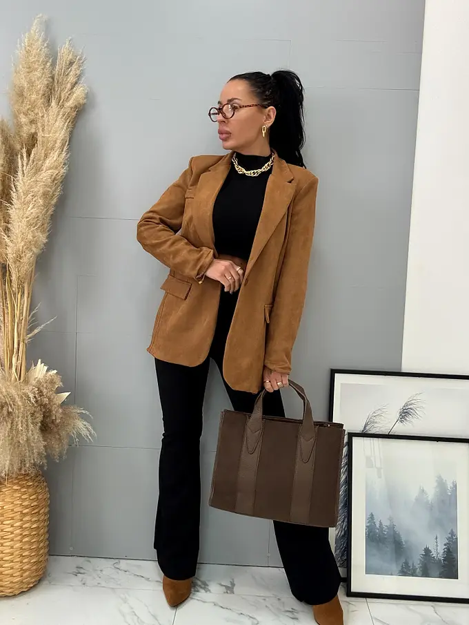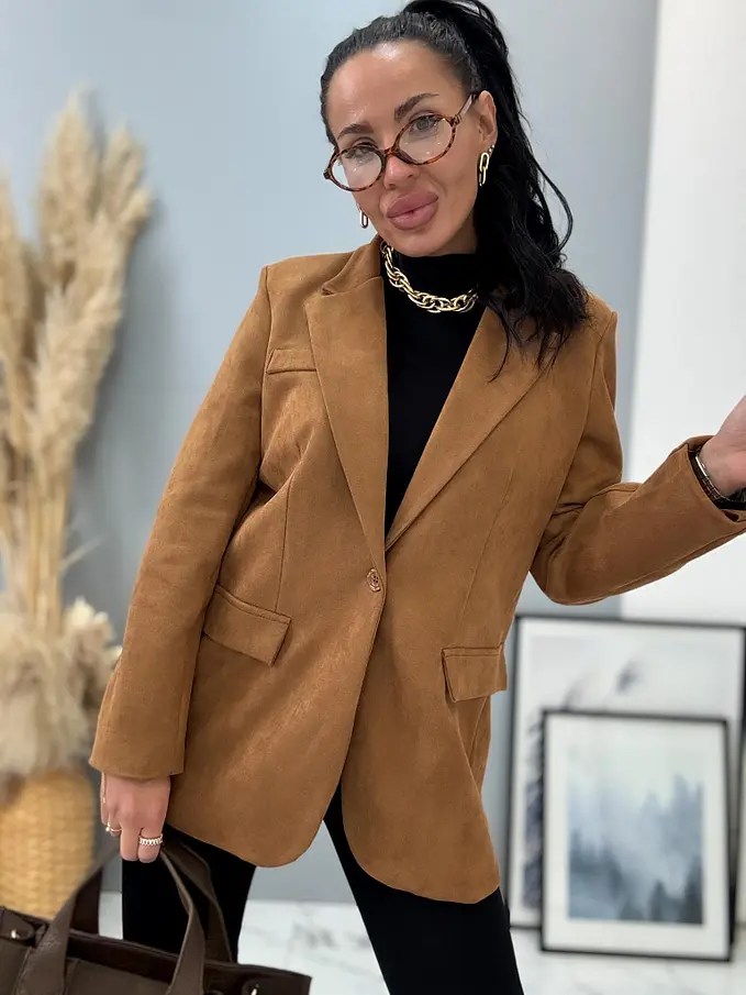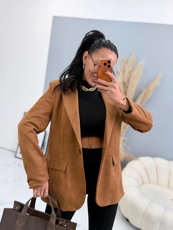 Dámske sako zo semišového materiálu. Materiál je mierne elastický. Má vypchávky v oblasti ramien. Je podšívané. S dvoma ozdobnými vreckami s patkami.