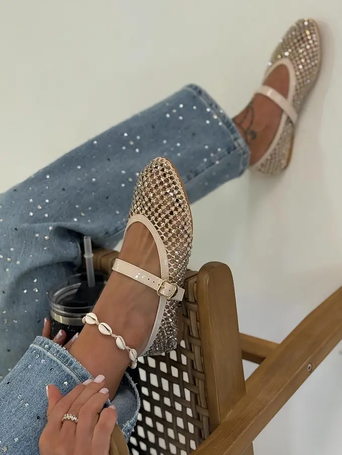 Trblietavé balerínky zdobené kamienkami, ktoré dodávajú outfitu jemný, ale výrazný akcent. Remienok cez priehlavok s nastaviteľným zapínaním zabezpečuje pohodlie a lepšiu fixáciu chodidla. Ideálna voľba k džínsom, šatám aj elegantnejším outfitom.