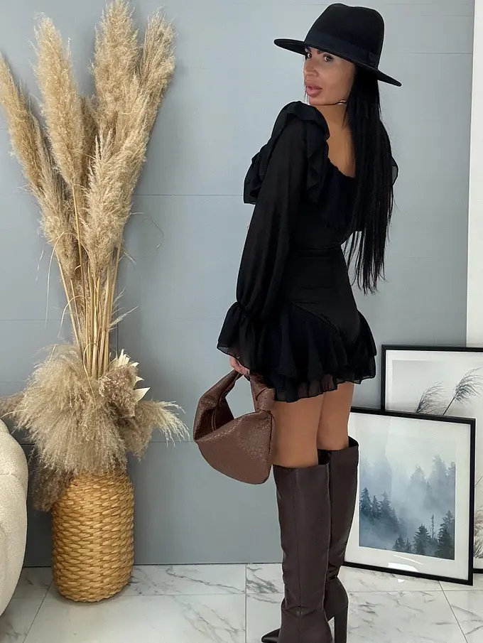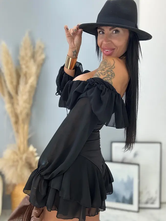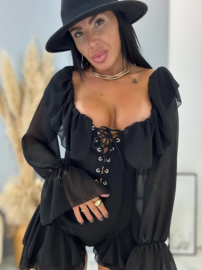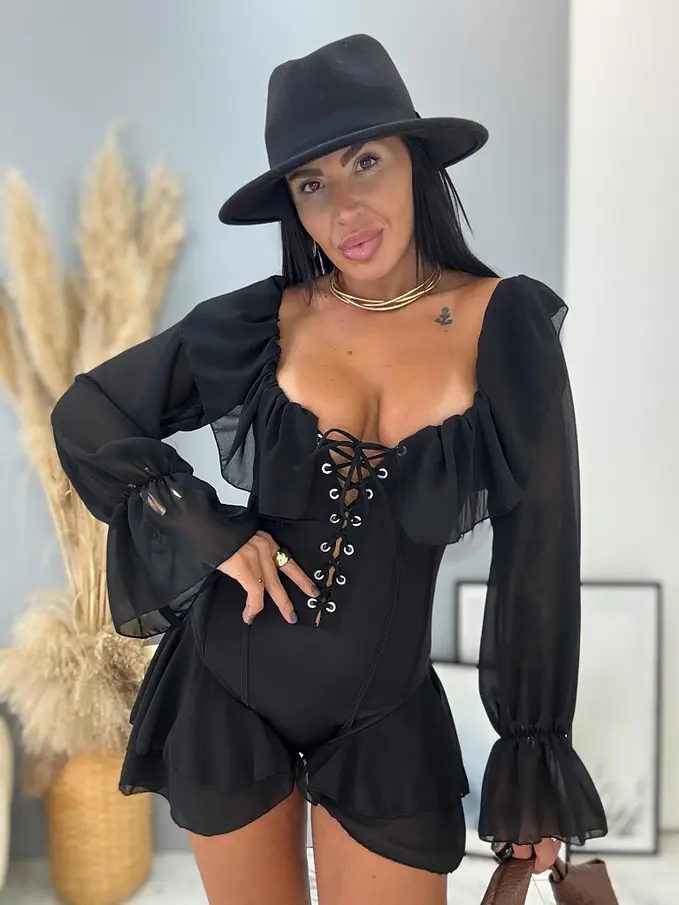 Šnurovací overál s volánikmi a odhalenými ramenami MINDY