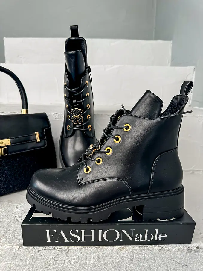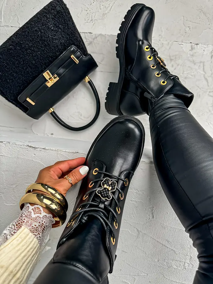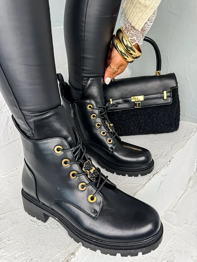 Štýlová aj v sychravom počasí? Čižmy perfektne doplnia napríklad slim džínsy a vestu z kožušinky. Doplnky majú zlatú farbu. Čižmy sú mierne tateplené.