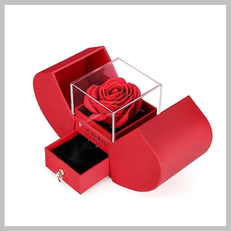 Táto elegantná šperkovnica s večnou ružou je dokonalým darčekom na Valentína alebo narodeniny. Má výsuvnú zásuvku na uloženie šperkov, ako sú náhrdelníky či prstene. Priehľadný plastový kryt chráni ružu pred prachom a zachováva jej krásny vzhľad.
