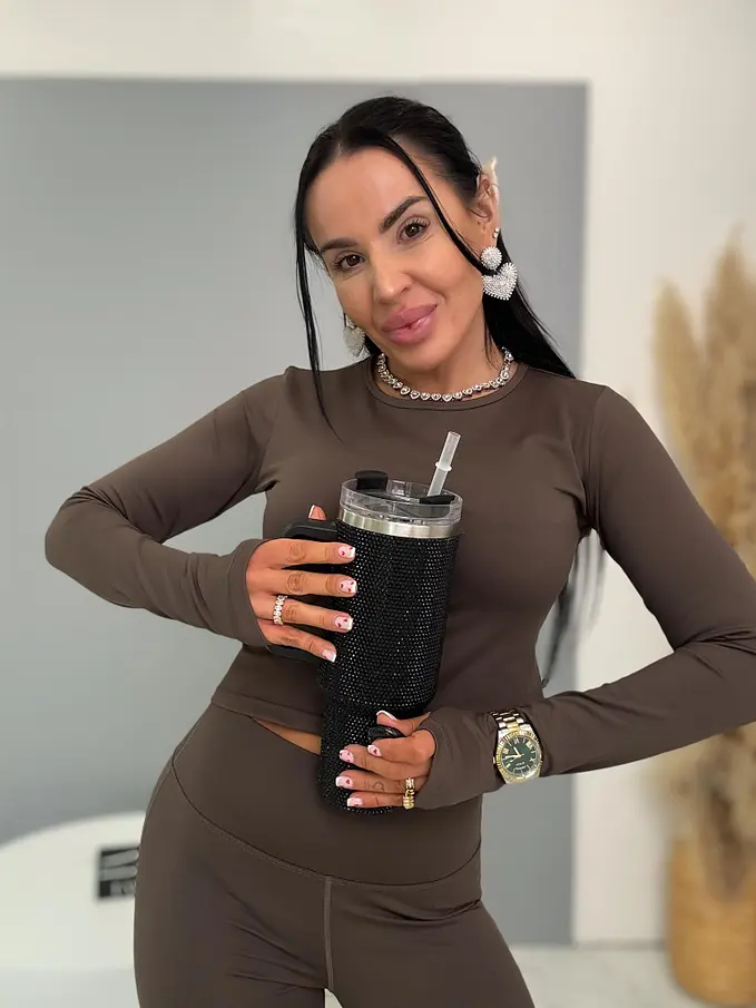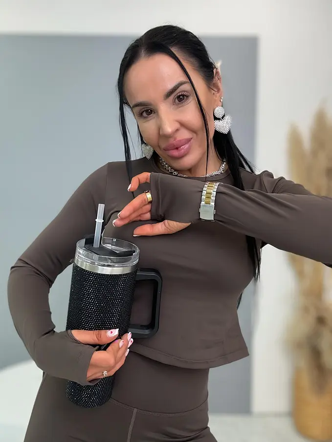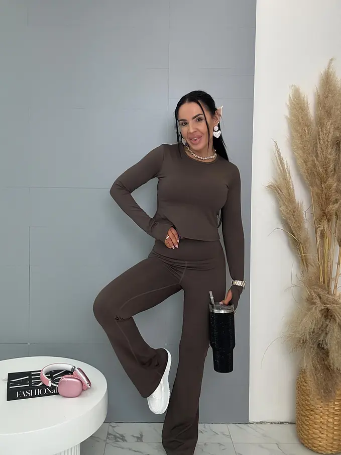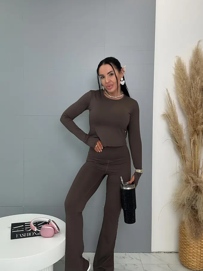 Módny komplet pre extravagantné ženy. Priamo z Francúzka. Set pozostáva z trička s dlhým rukávom a legíny s tvarovaným zadkom. Materiál je elastický. Nohavice majú gumený pás.