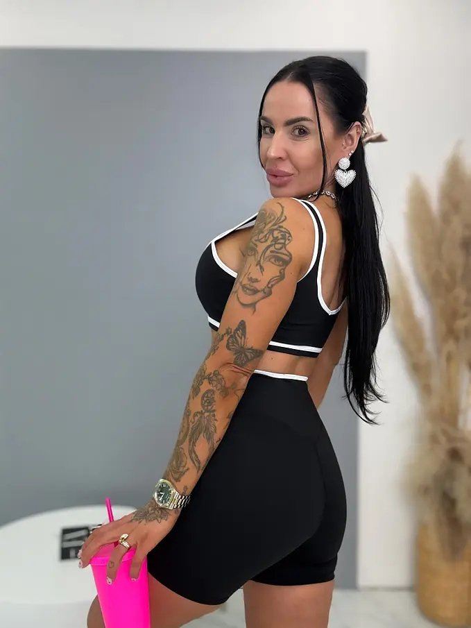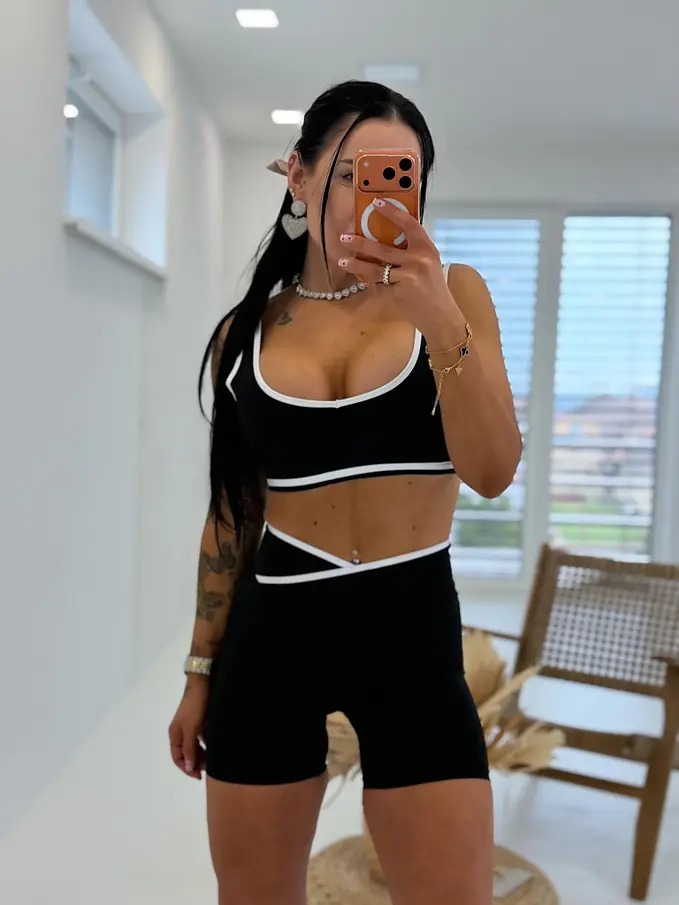 Módny komplet pre extravagantné ženy. Set pozostáva z crop-topu a šotky. Materiál je elastický, nepriehľadný, kvalitný, ktorý zakrýva nedostatky pokožky. Nohavice majú gumený pás.