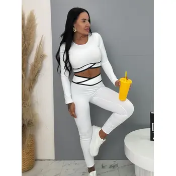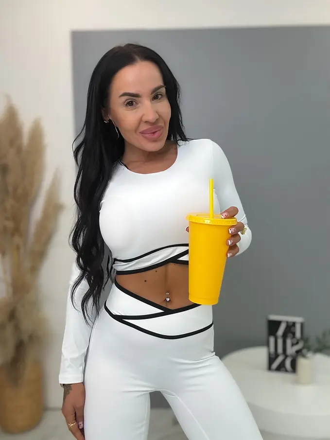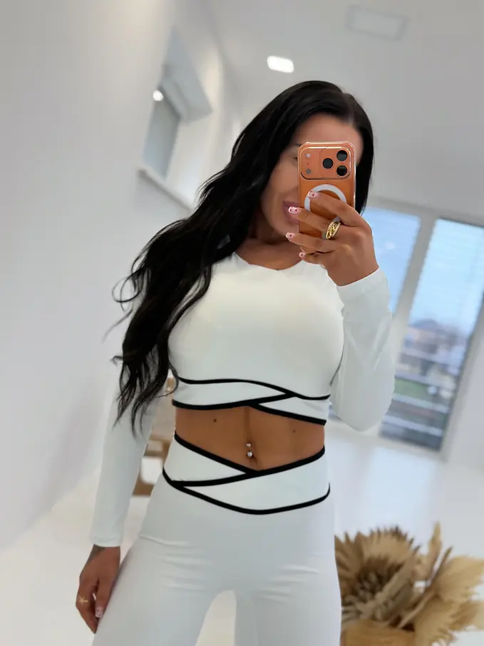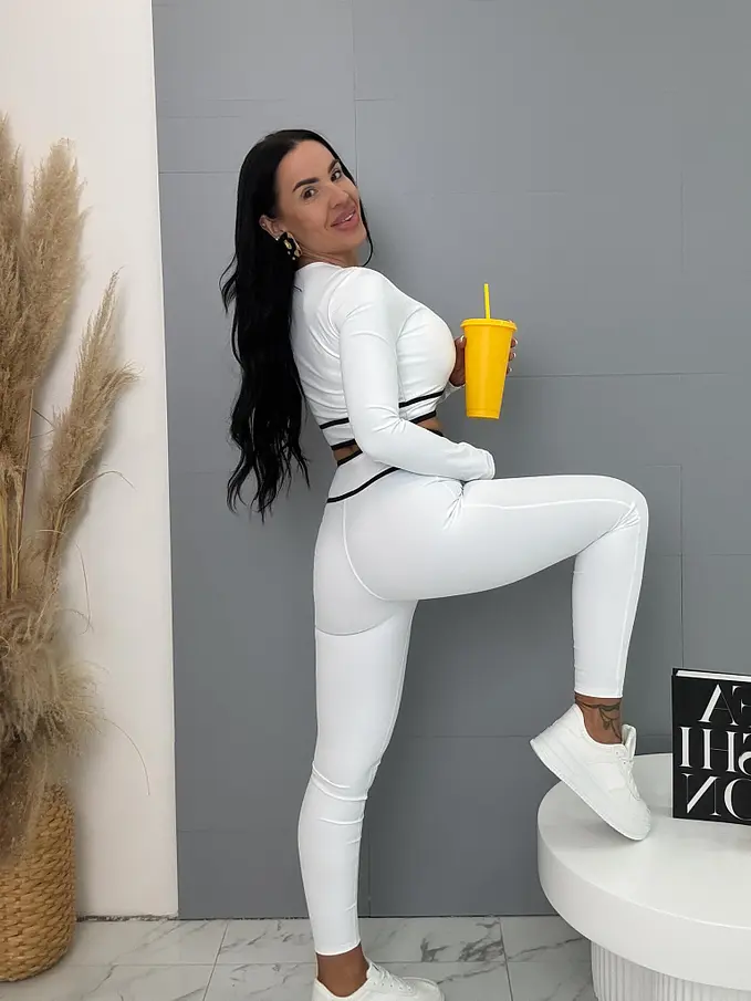 Módny komplet pre extravagantné ženy. Set pozostáva z dlhého rukávu crop-topu a legín. Materiál je elastický, nepriehľadný, kvalitný, ktorý zakrýva nedostatky pokožky. Nohavice majú gumený pás.
