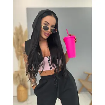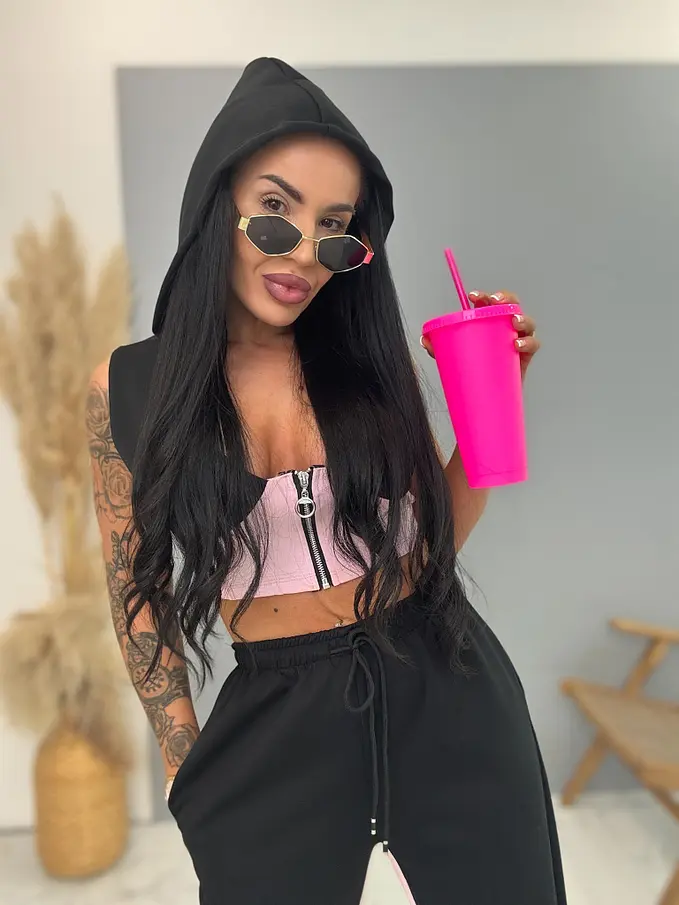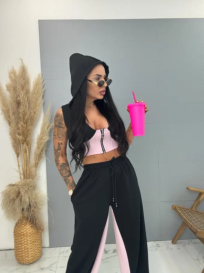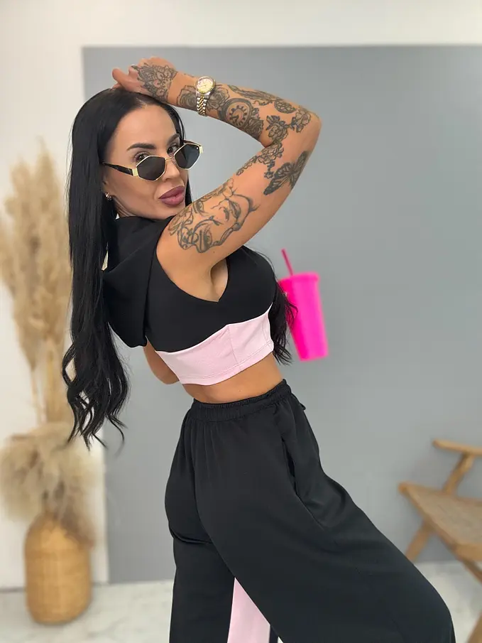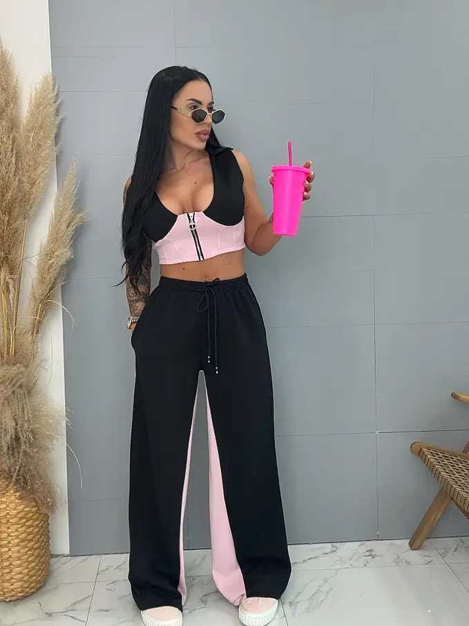 Módny komplet pre extravagantné ženy. Set pozostáva z crop-topu a nohavíc. Materiál je elastický, nepriehľadný, kvalitný. Nohavice majú gumený pás.