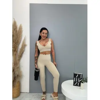 Módny komplet pre extravagantné ženy. Komplet sa pozozstáva z crop-topu a legíniek. Materiál je elastický, nepriehľadný, kvalitný, ktorý zakrýva nedostatky pokožky. Nohavice majú gumený pás. Crop top s vypchávkami na prsia.