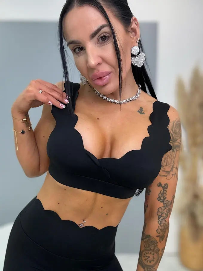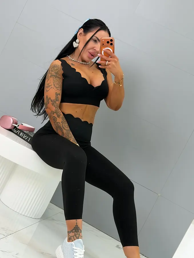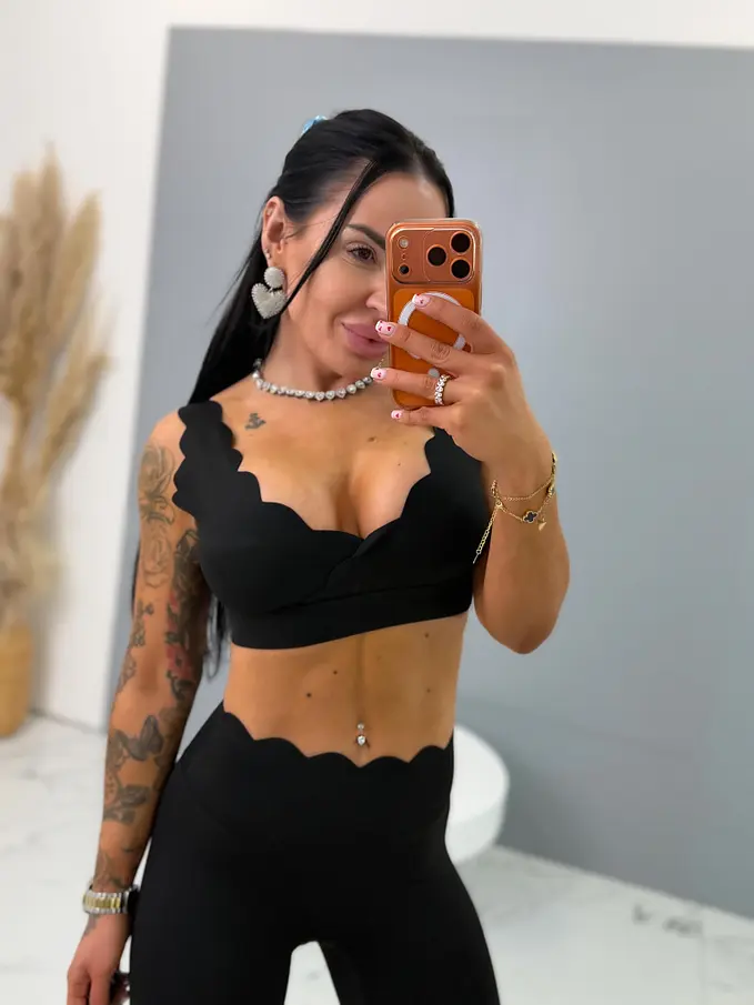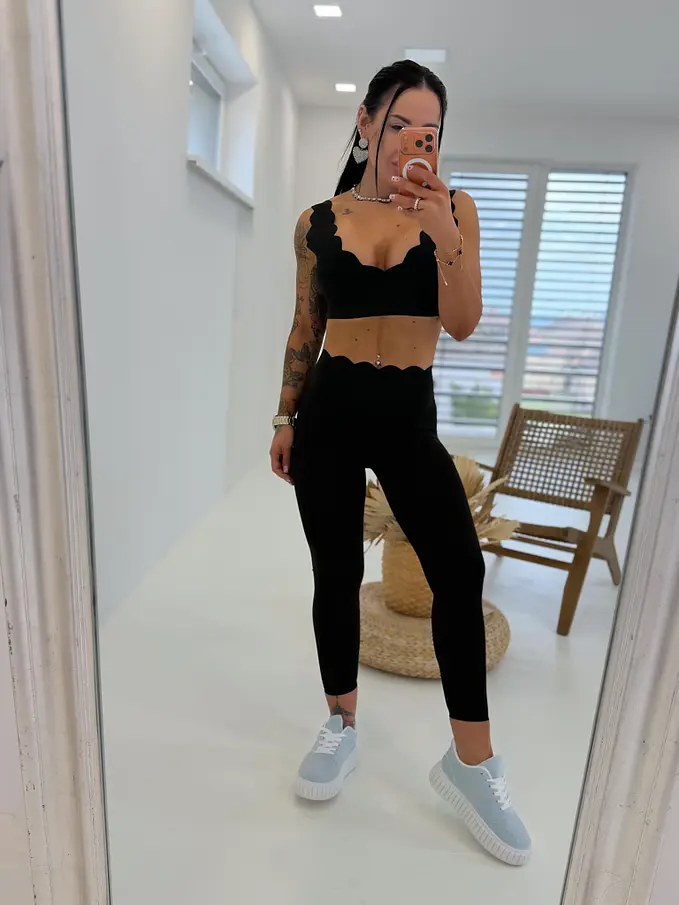 Módny komplet pre extravagantné ženy. Komplet sa pozozstáva z crop-topu a legíniek. Materiál je elastický, nepriehľadný, kvalitný, ktorý zakrýva nedostatky pokožky. Nohavice majú gumený pás. Crop top s vypchávkami na prsia.