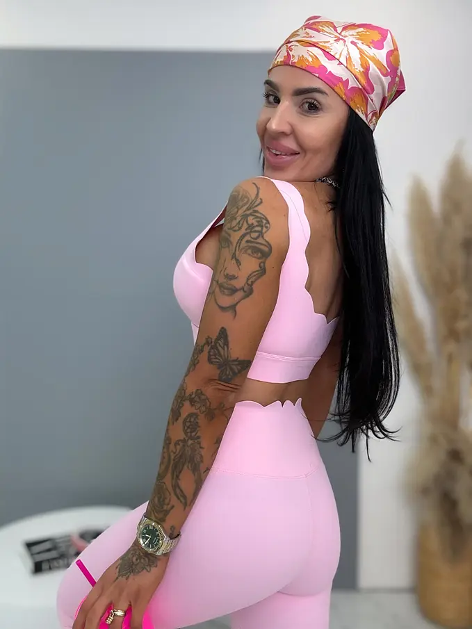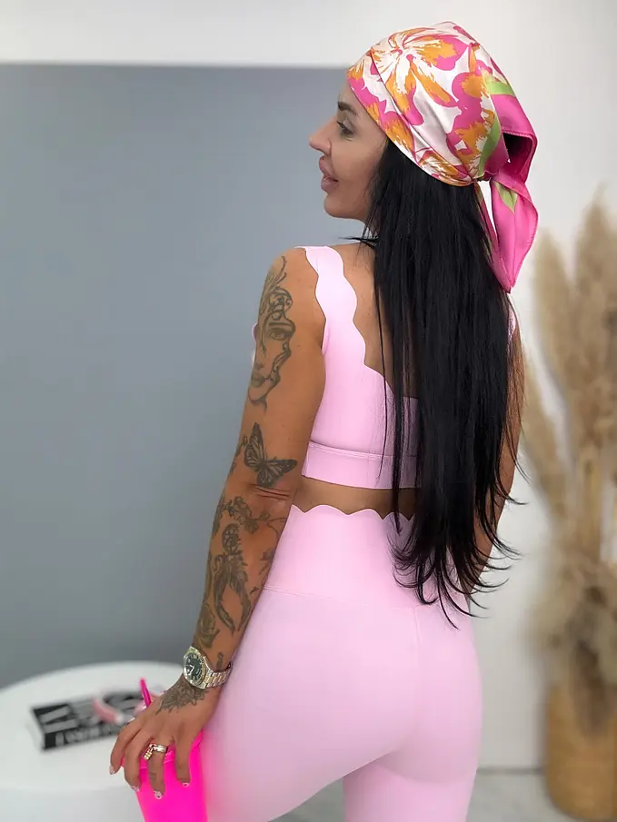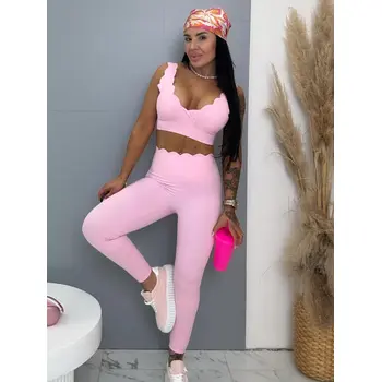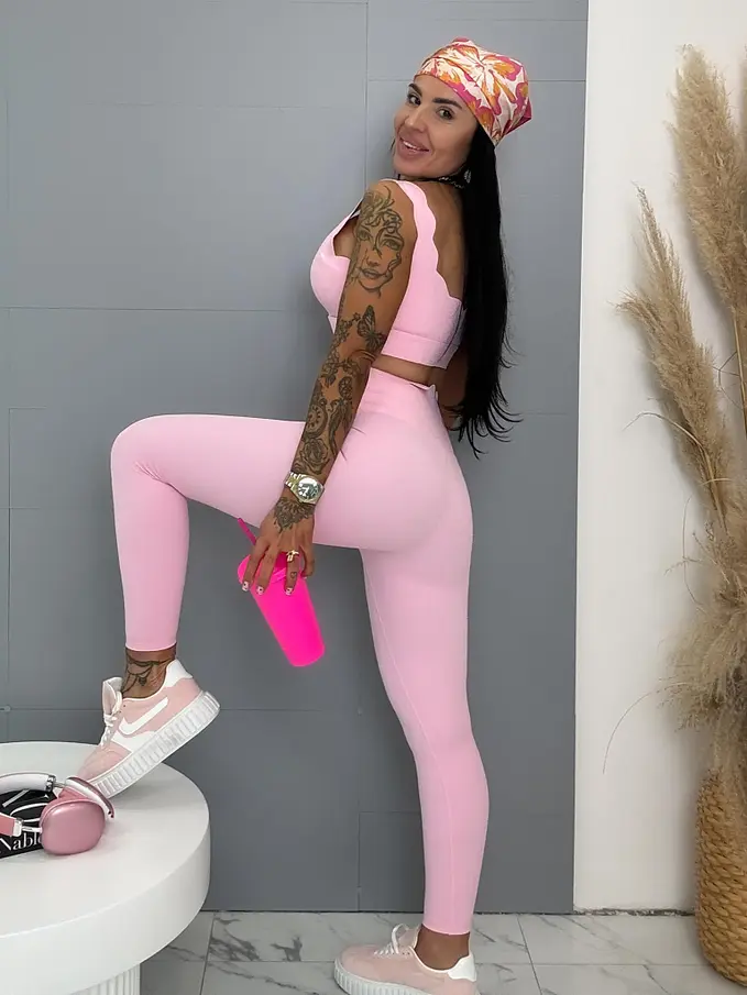 Módny komplet pre extravagantné ženy. Komplet sa pozozstáva z crop-topu a legíniek. Materiál je elastický, nepriehľadný, kvalitný, ktorý zakrýva nedostatky pokožky. Nohavice majú gumený pás. Crop top s vypchávkami na prsia.