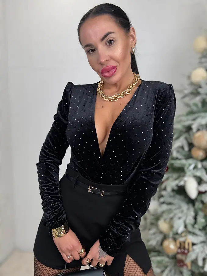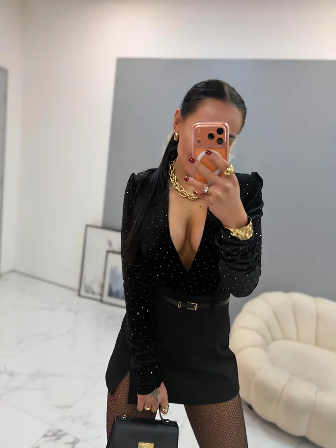 Modelka čiernovláska meria 164 cm a váži 57 kg.