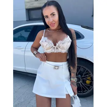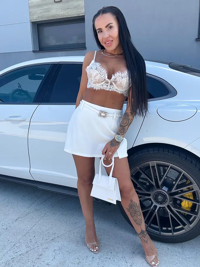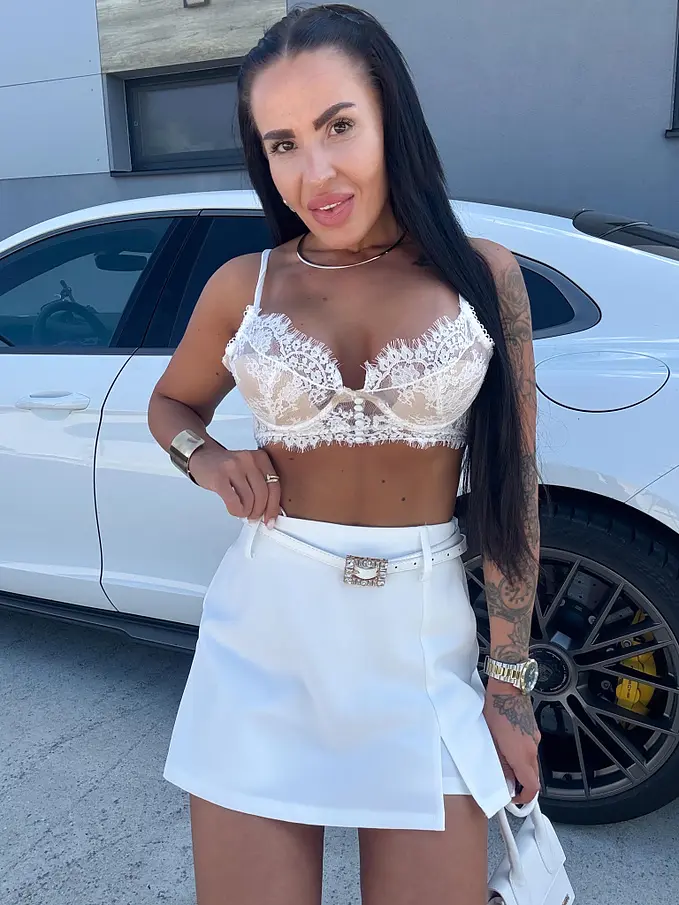 Modelka čiernovláska meria 164 cm a váži 57 kg. Nosí veľkosť S.