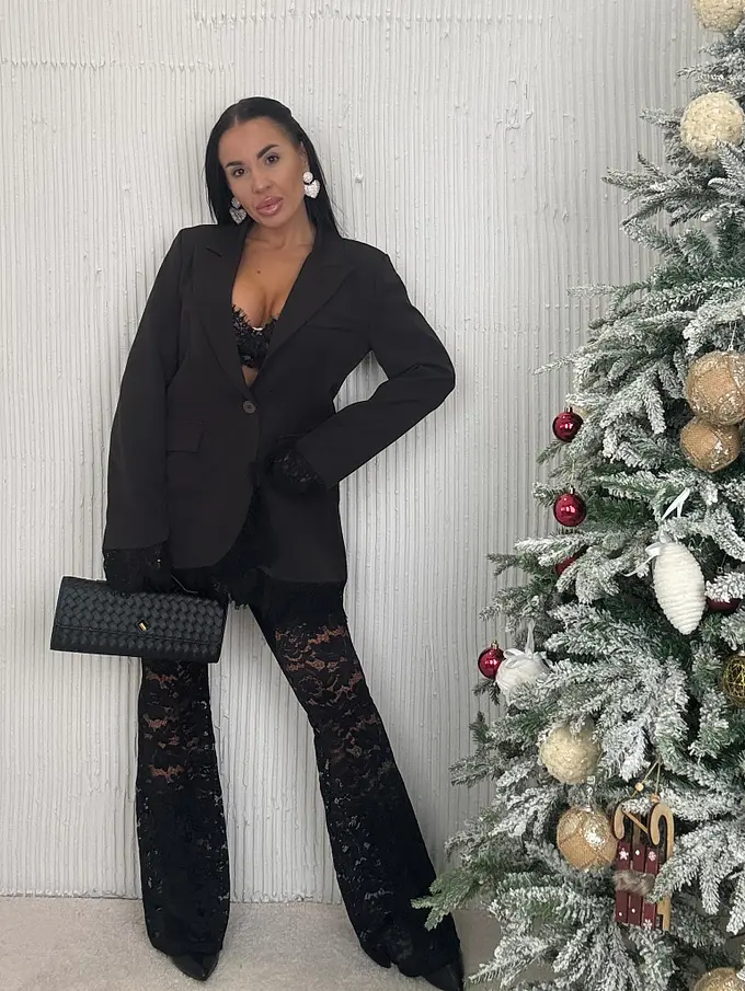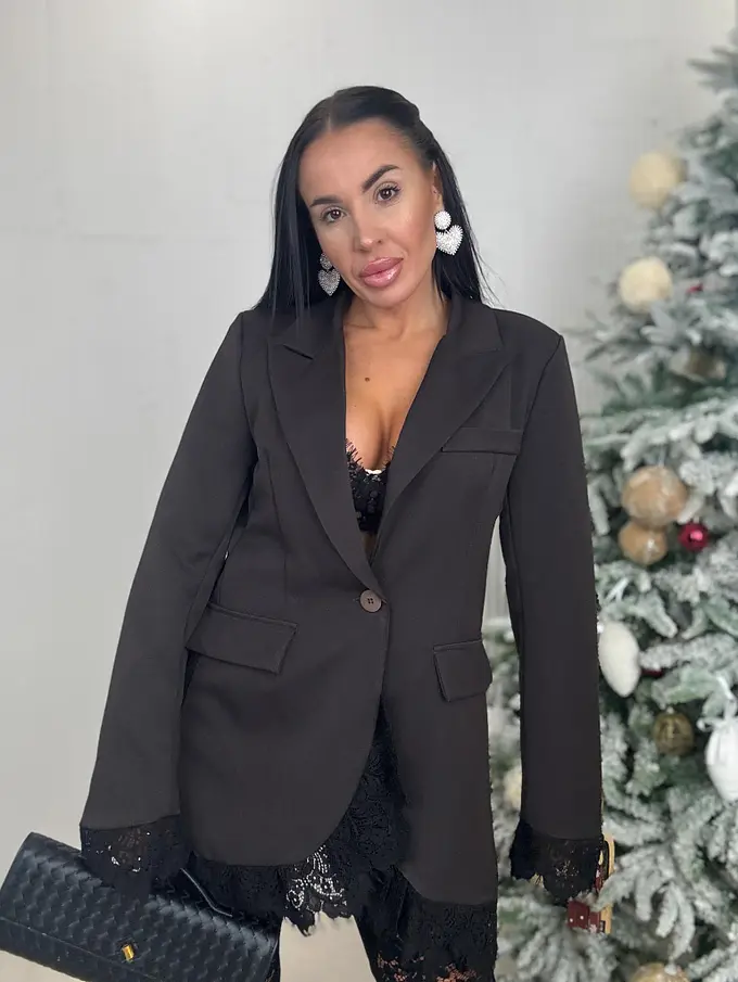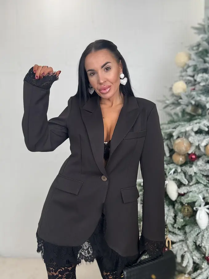 Dámske sako z príjemného materiálu. Materiál nie je elastický. Sako sa zapína na gombík. Má vypchávky v oblasti ramien. Priehľadnými čipkovými vsadkami.