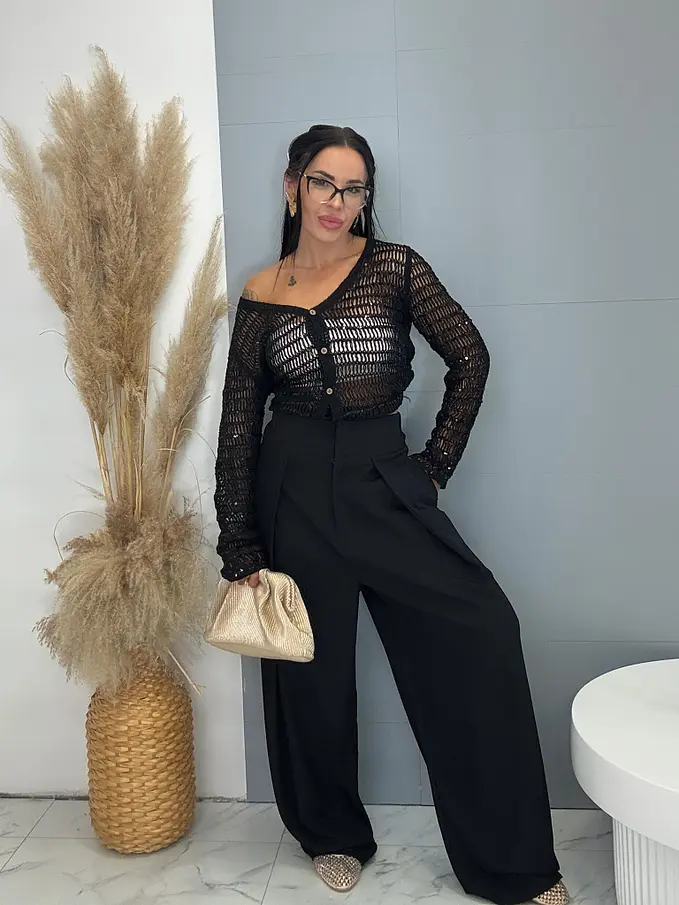 Kardigar je vyrobený z príjemného materiálu, háčkovaný s flitrami, elastický materiál