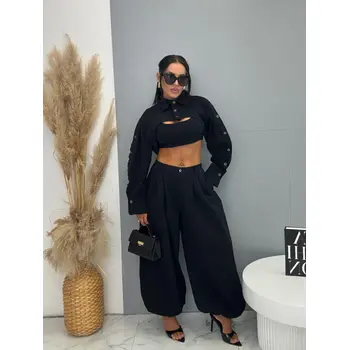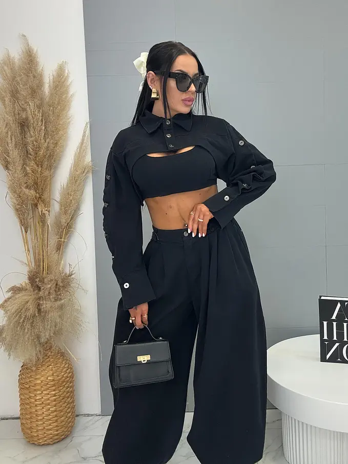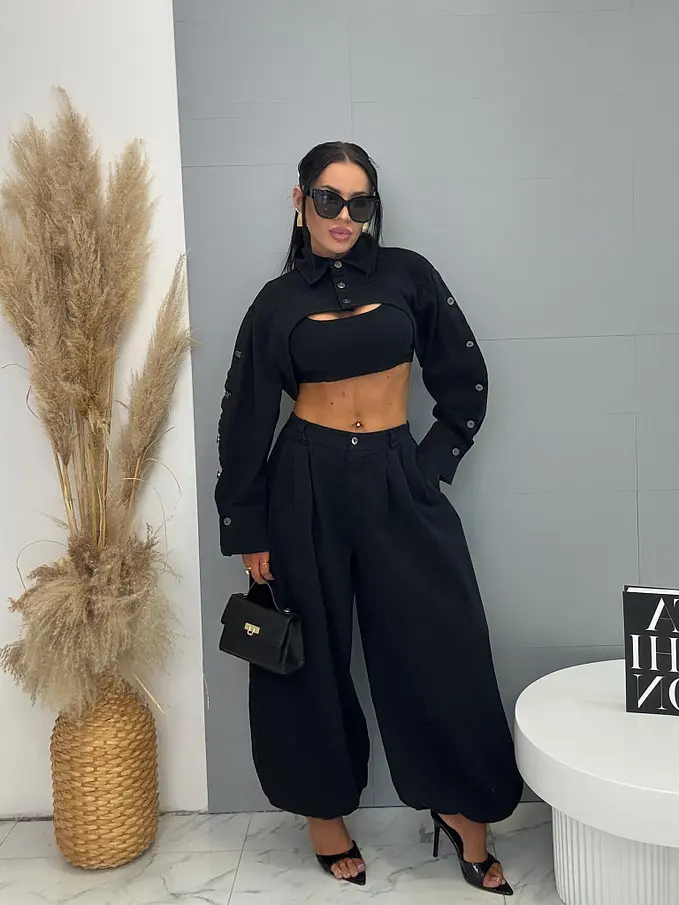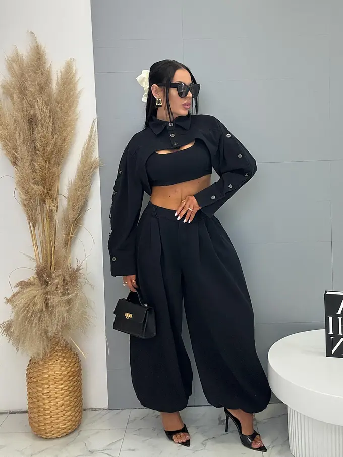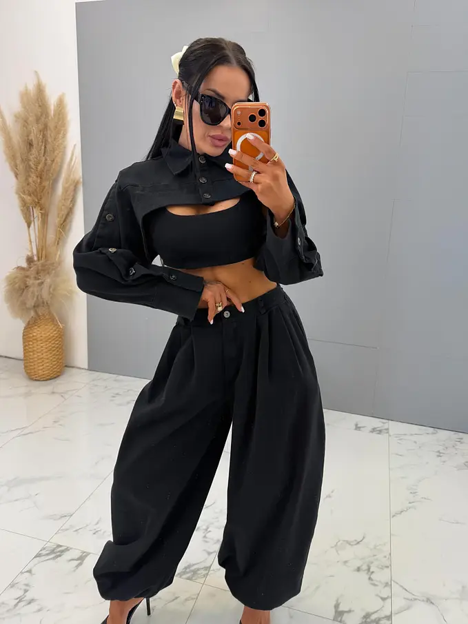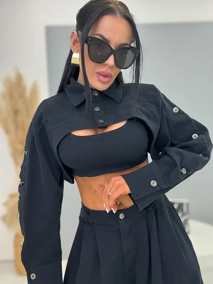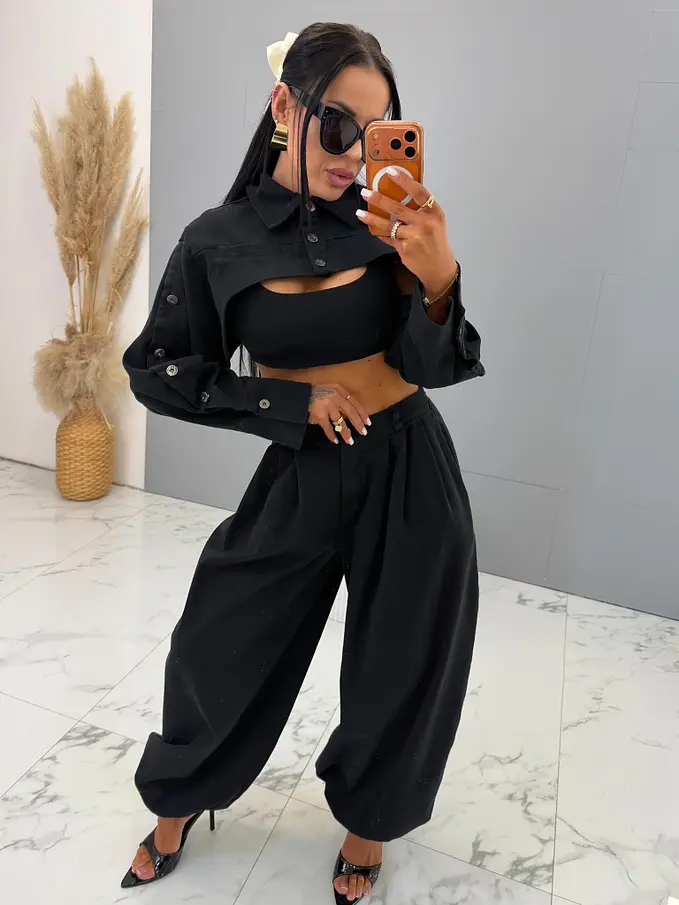 Trojdielny denim komplet priamo z Talianska, prémiová kvalita. Material je príjemne elastický. Set pozostáva z crop topu, bundy a nohavíc. Nohavice majú vysoký elastický pás, spodok zakončený gumou a praktické bočné vrecká. Crop top sa zapína na zips na chrbte. Krátka bunda so čierno-stribornými gombíkmi.