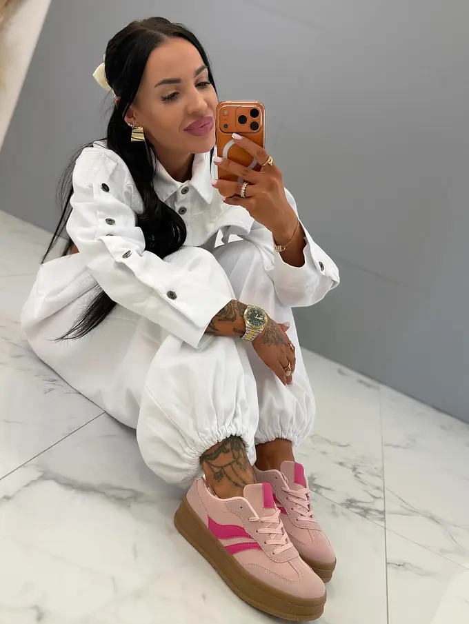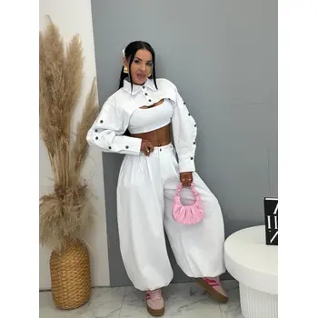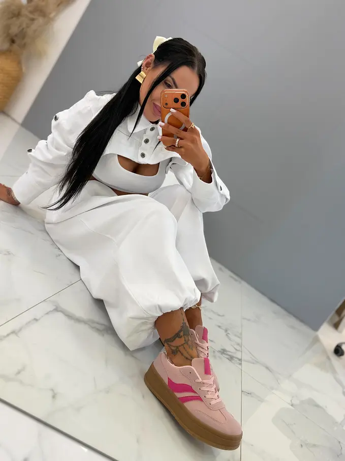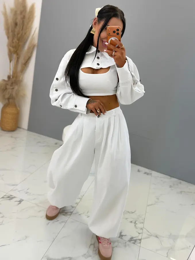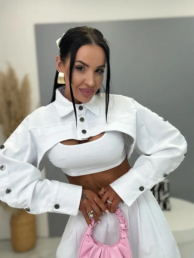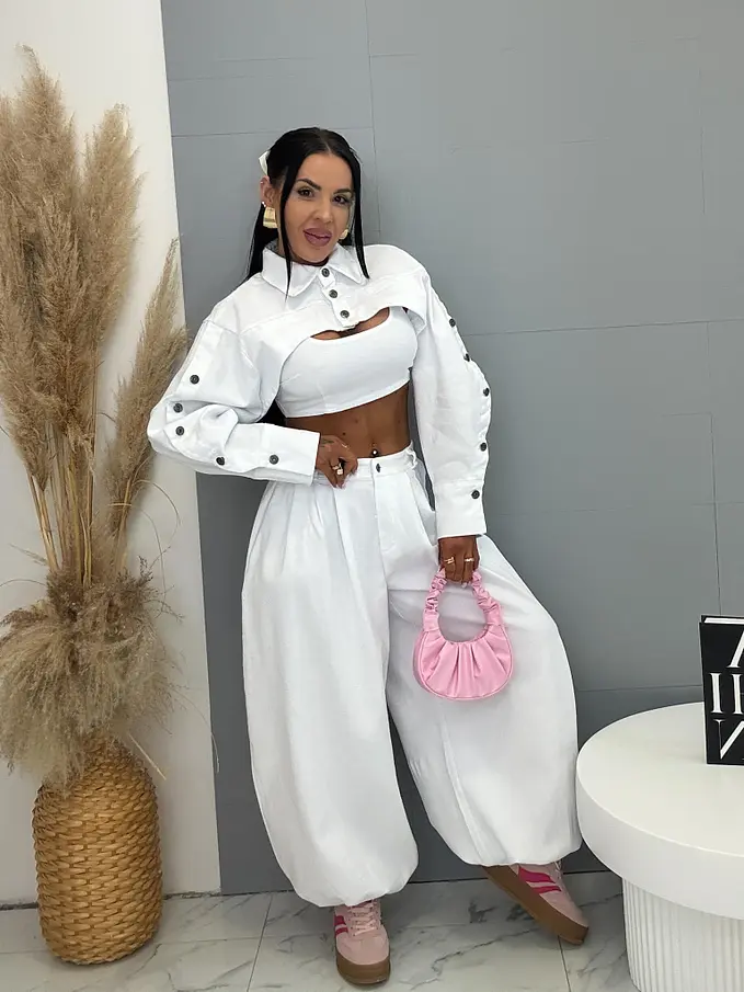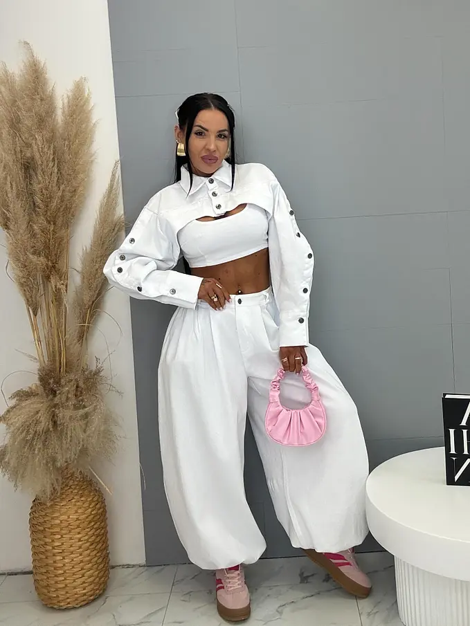 Trojdielny denim komplet priamo z Talianska, prémiová kvalita. Material je príjemne elastický. Set pozostáva z crop topu, bundy a nohavíc. Nohavice majú vysoký elastický pás, spodok zakončený gumou a praktické bočné vrecká. Crop top sa zapína na zips na chrbte. Krátka bunda so čierno-stribornými gombíkmi.