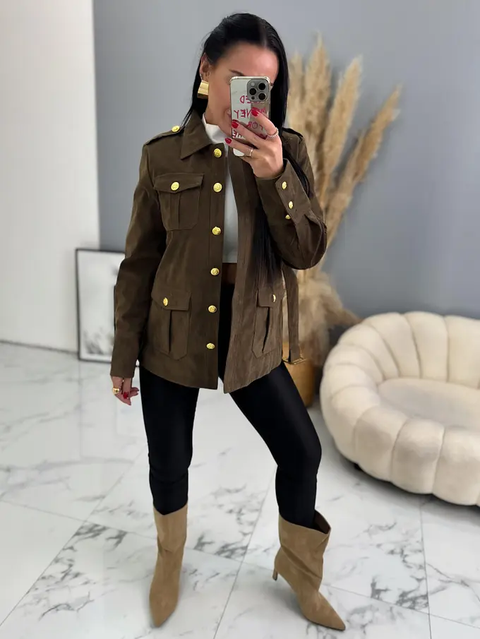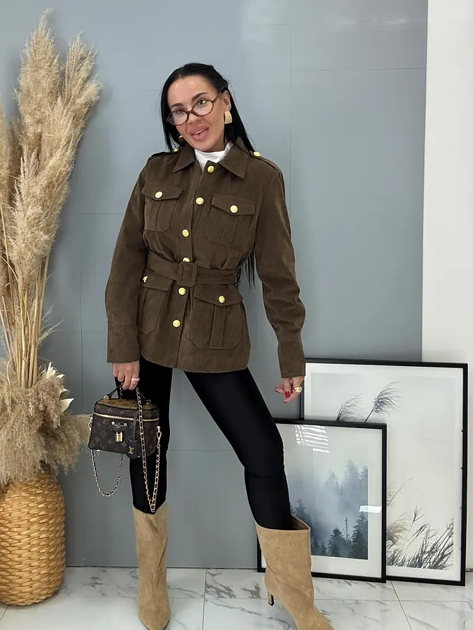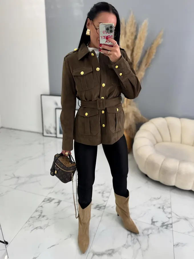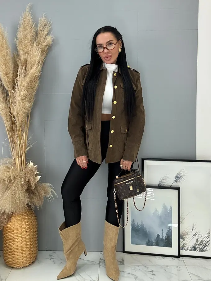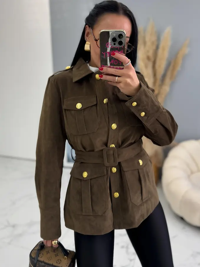 Bunda je vyrobený z príjemného materiálu. S prednými vreckami a opaskom. Gombíky v zlatej farbe.