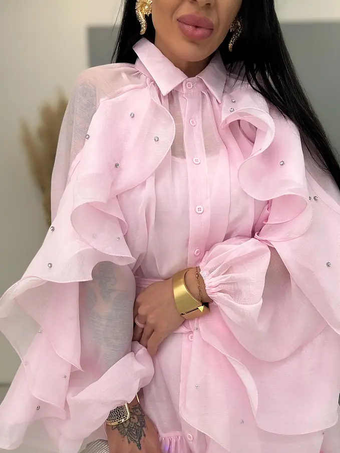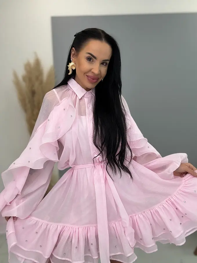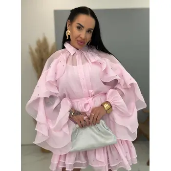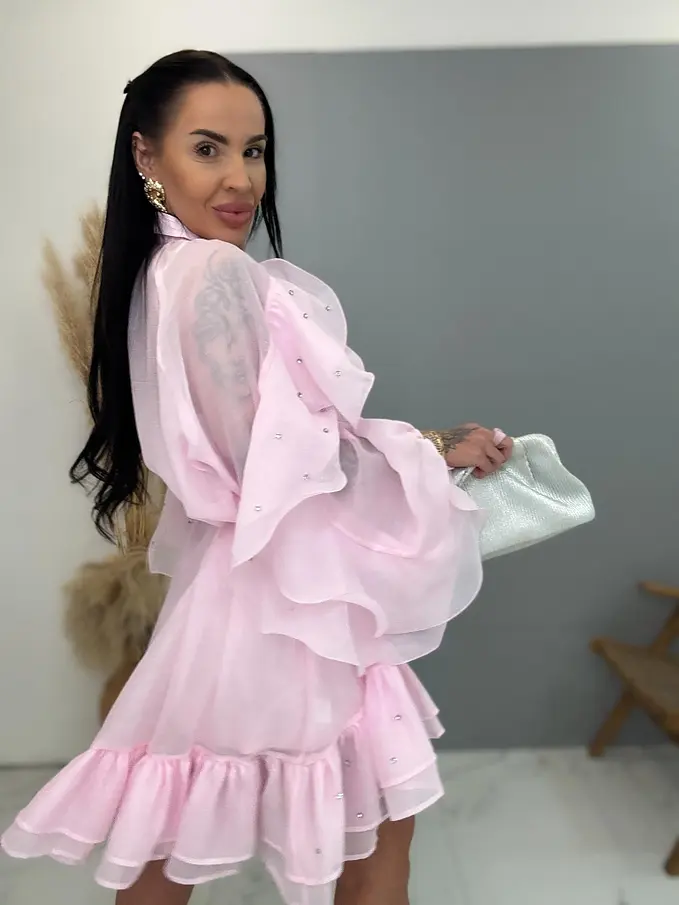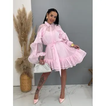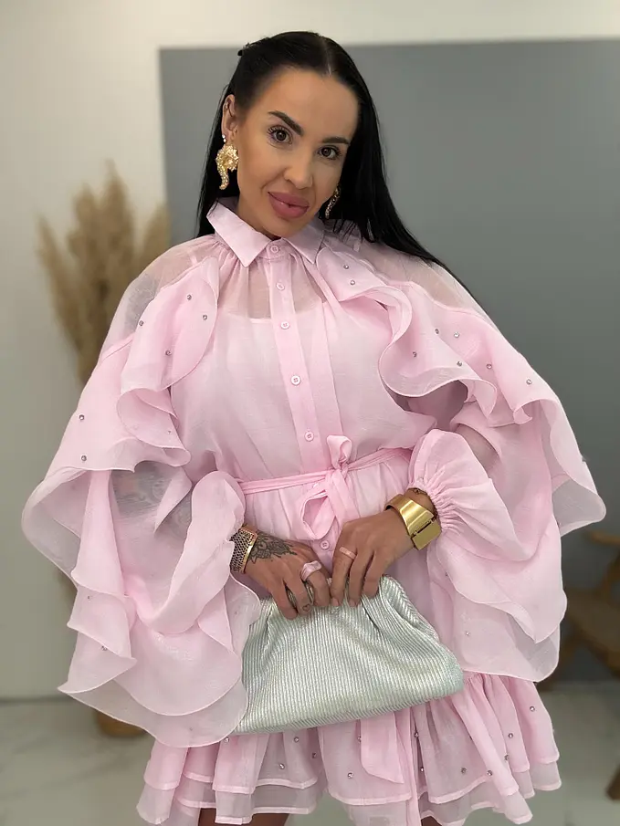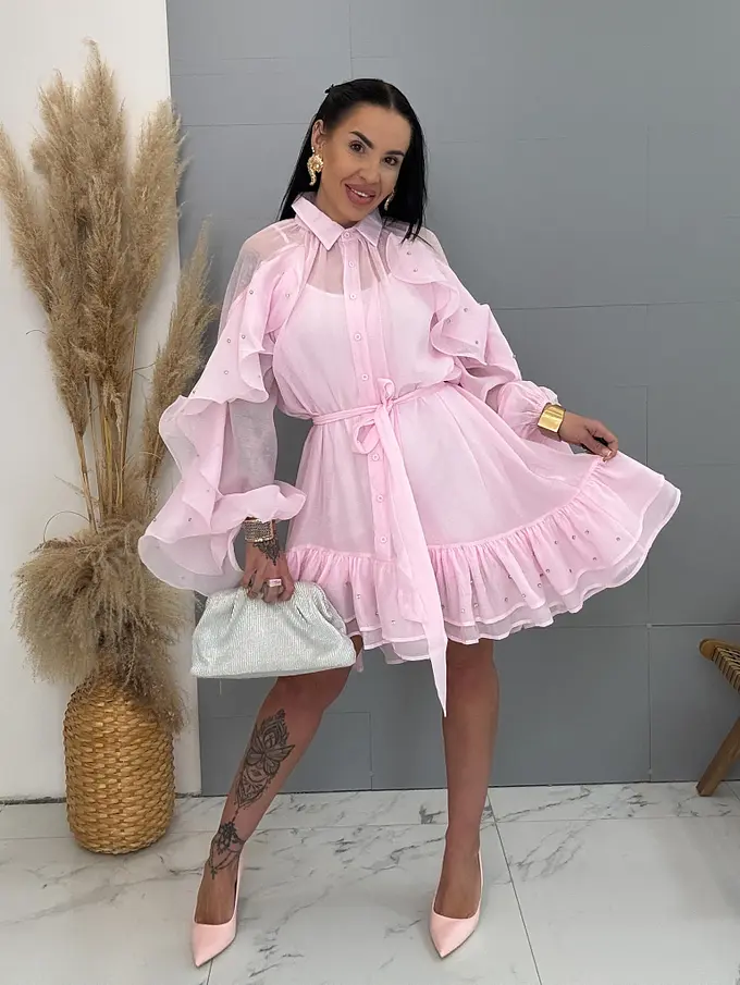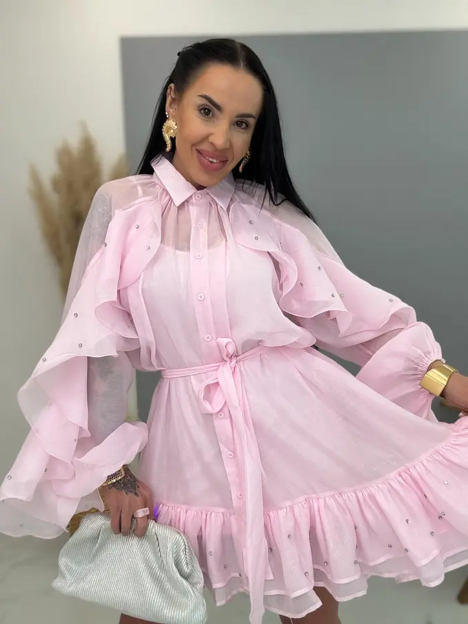 Volánové šifónové šaty zdobené kamienkami s opaskom LUXURY