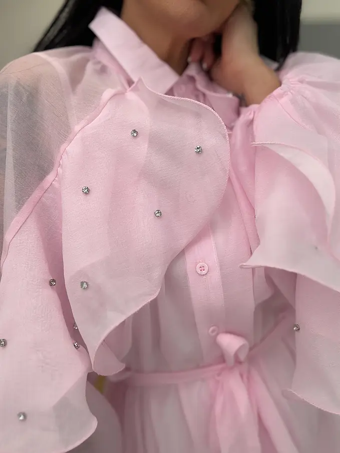 Elegantné šifónové šaty zdobené s kamienkami a opaskom. Materiál nie je elastický. Zapínanie na gombíky. So spodničkou.