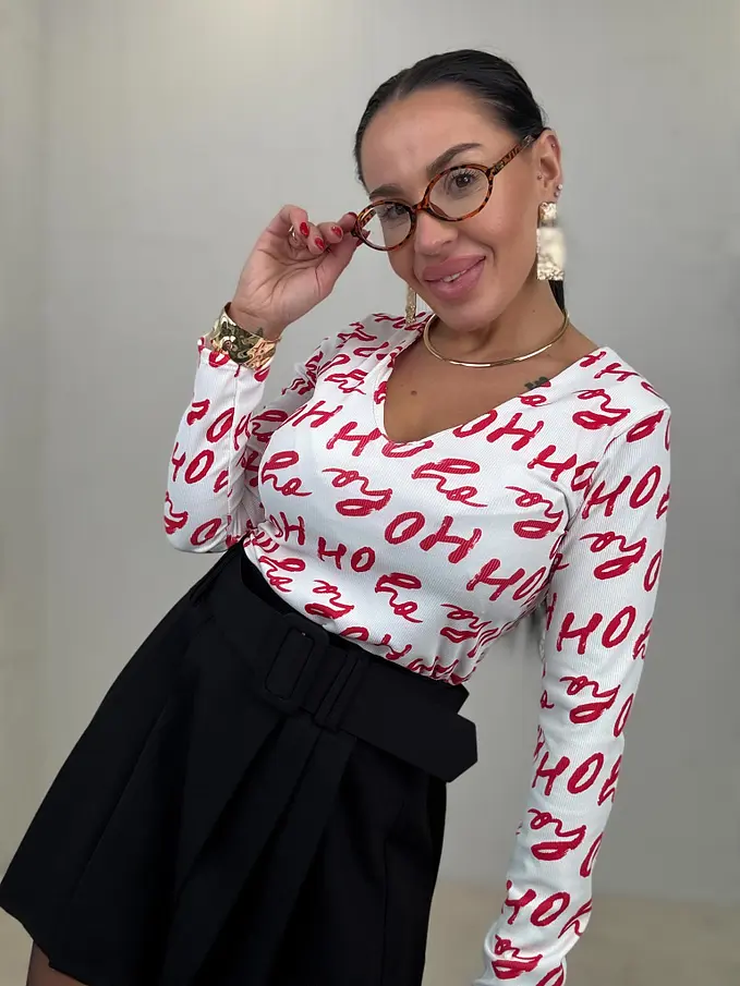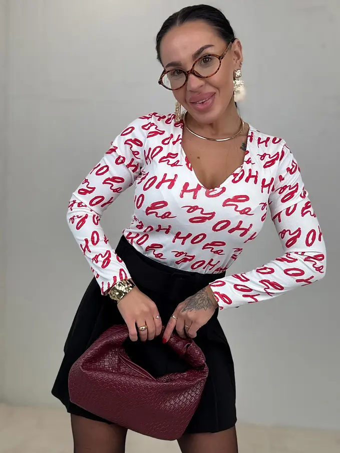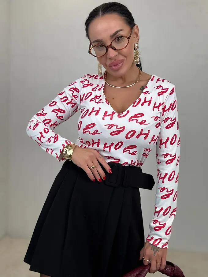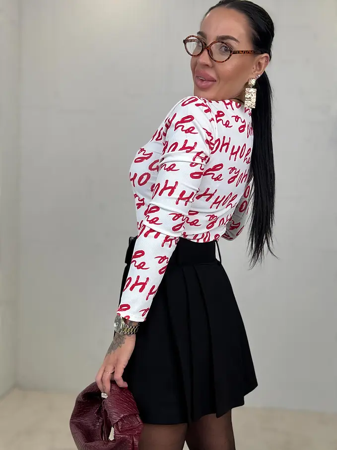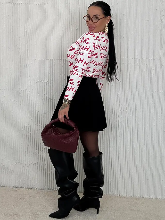 Modelka čiernovláska meria 164 cm a váži 64 kg. Nosí veľkosť M/L. Miery: 99 cm - 74 cm - 93 cm.