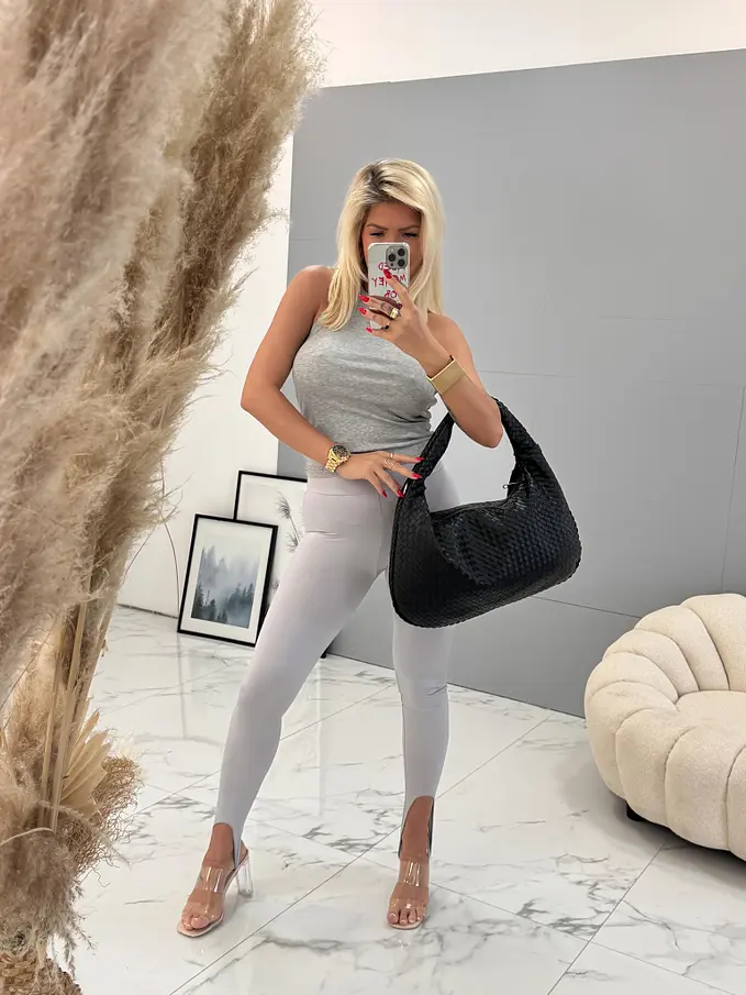 Modelka čiernovláska meria 164 cm a váži 64 kg. Nosí veľkosť M/L. Miery: 99 cm - 74 cm - 93 cm.