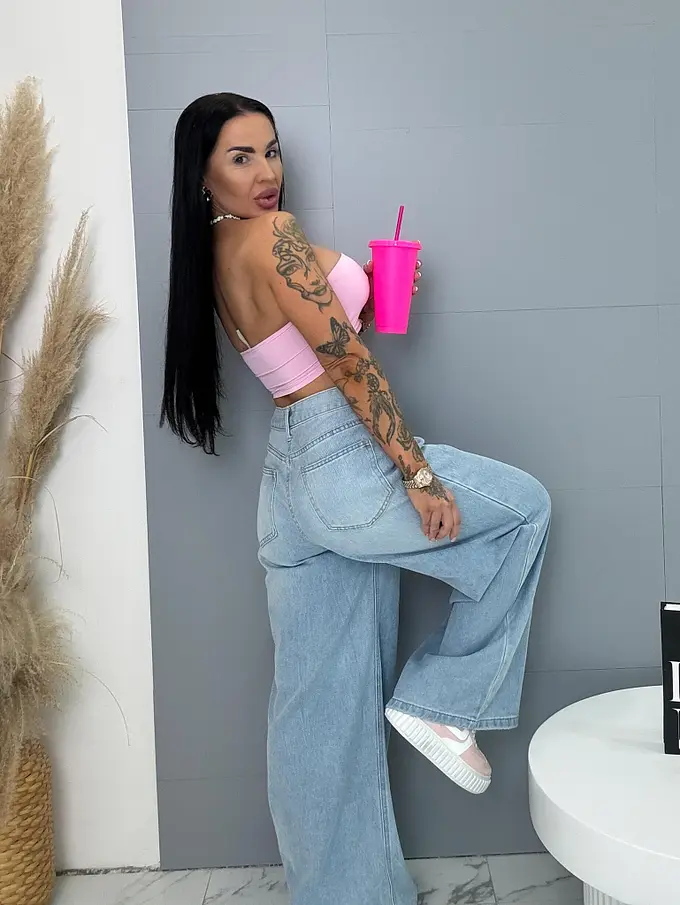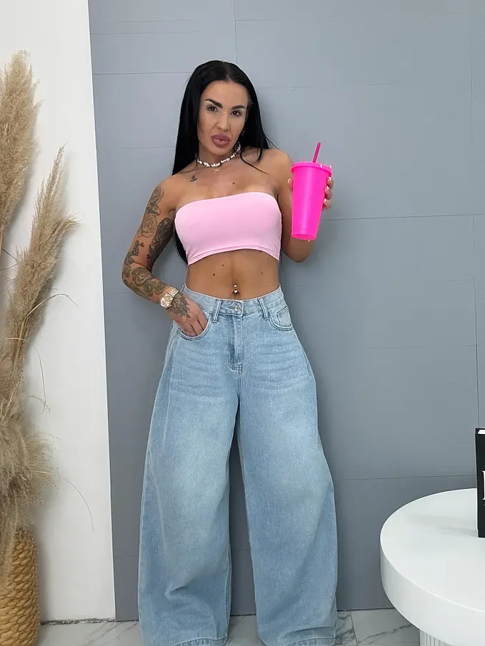 Modelka meria 164 cm a váži 57 kg. Má na sebe veľkosť S