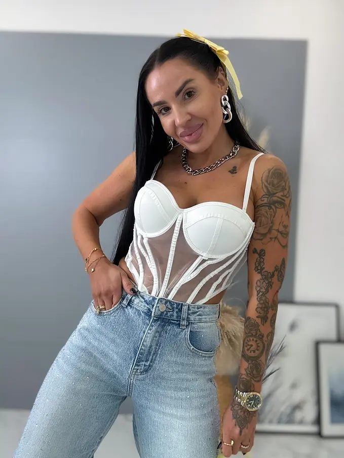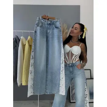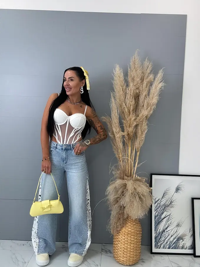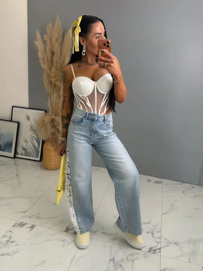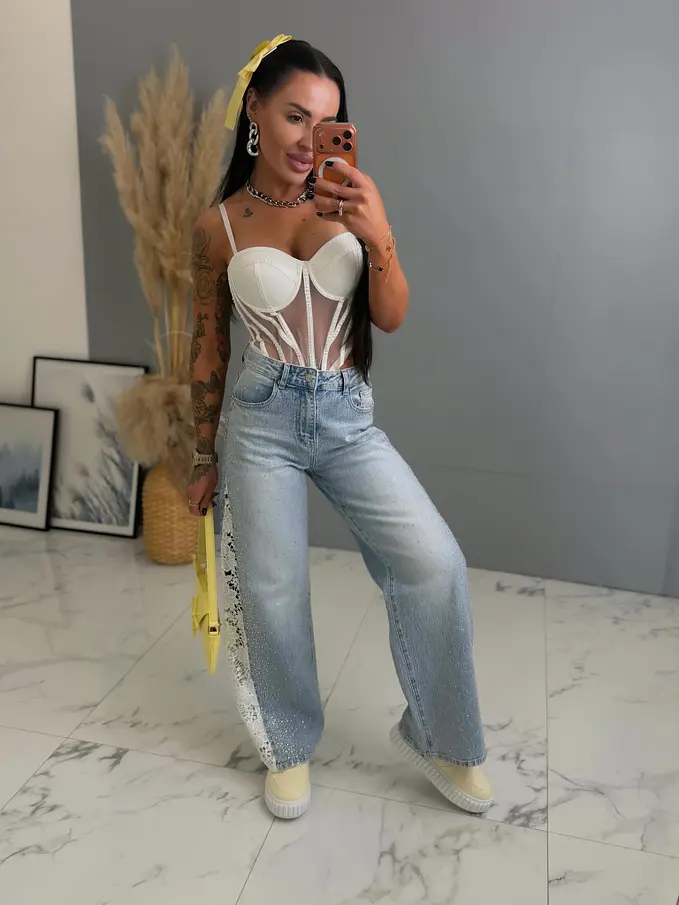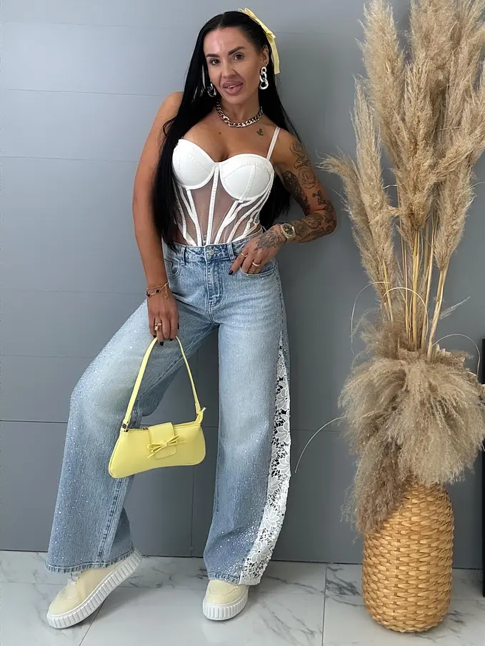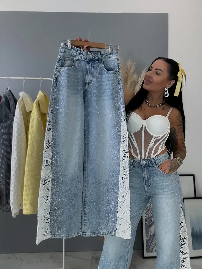 Vysokopásové wide leg rifle zdobené kamienkami a čipkou