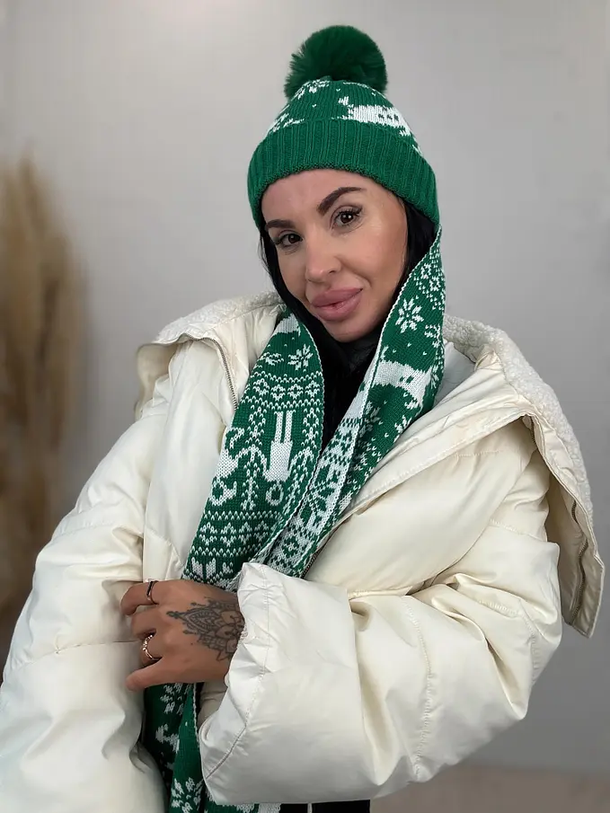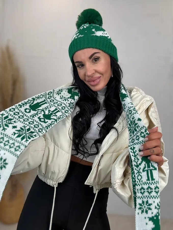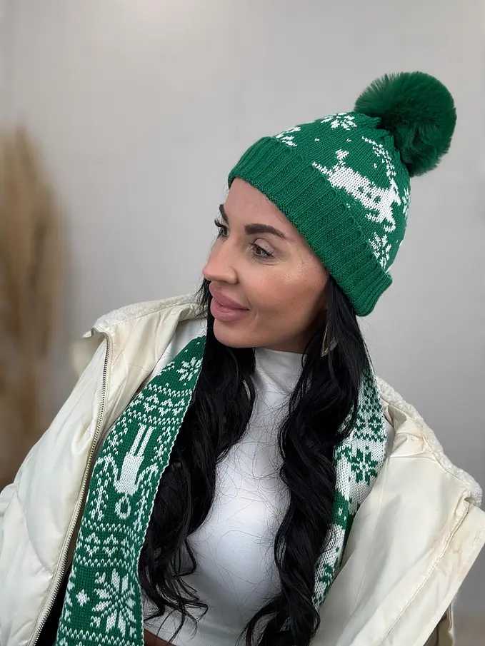Vzorovaná teplá čiapka s brmbolcom a šálom