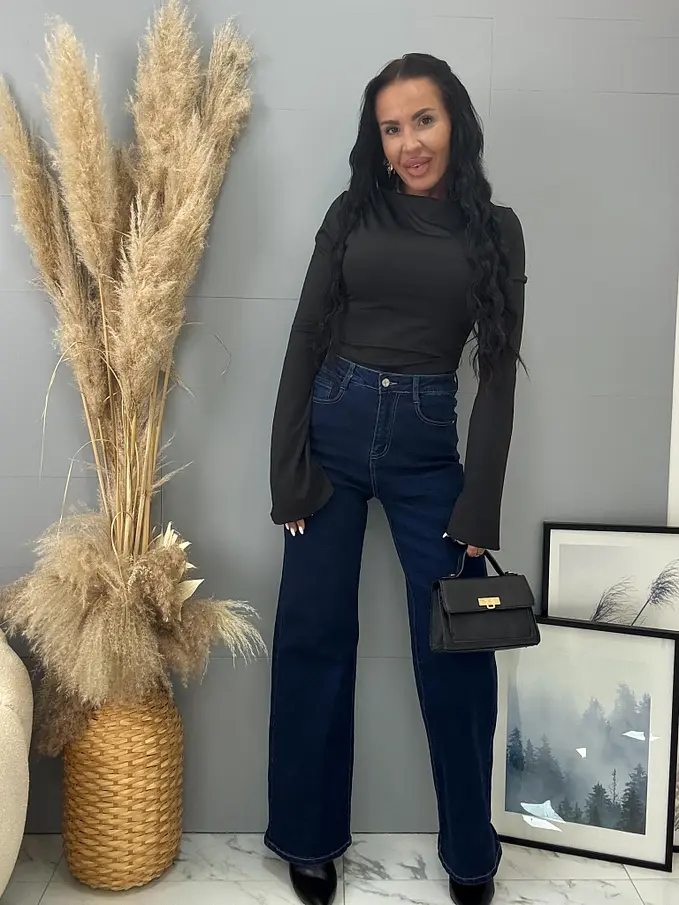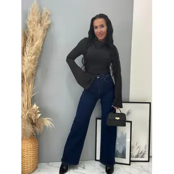 Džínsy wide leg, charakterizované širokými, rovnými nohavicami. Tento model s vysokým pásom je vyrobený z mierne elastickej látky. Gombík v strieborne farbe.