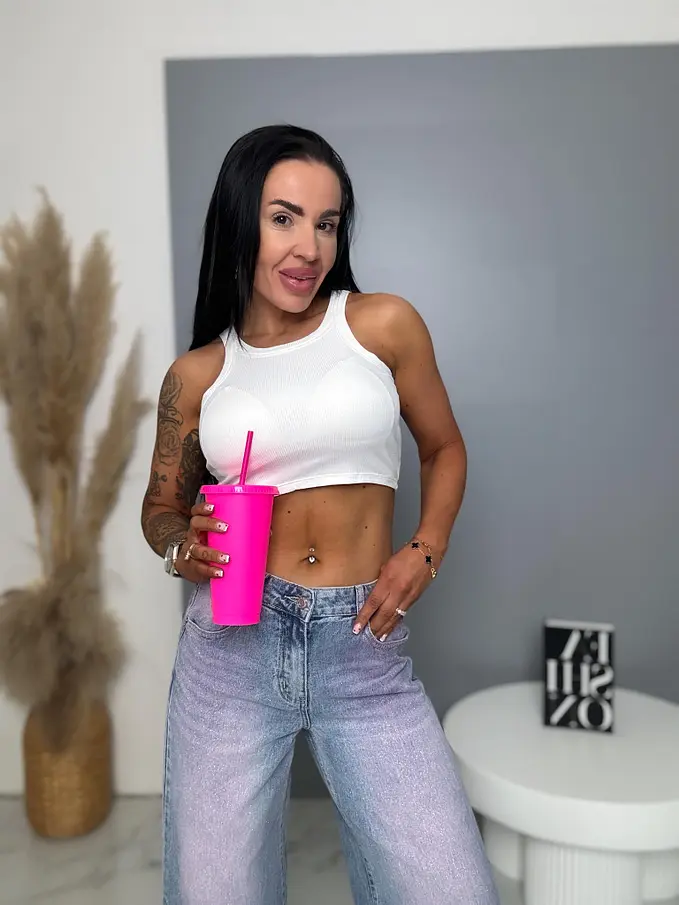 Modelka je 164 cm a váži 57 kg. Má na sebe S.