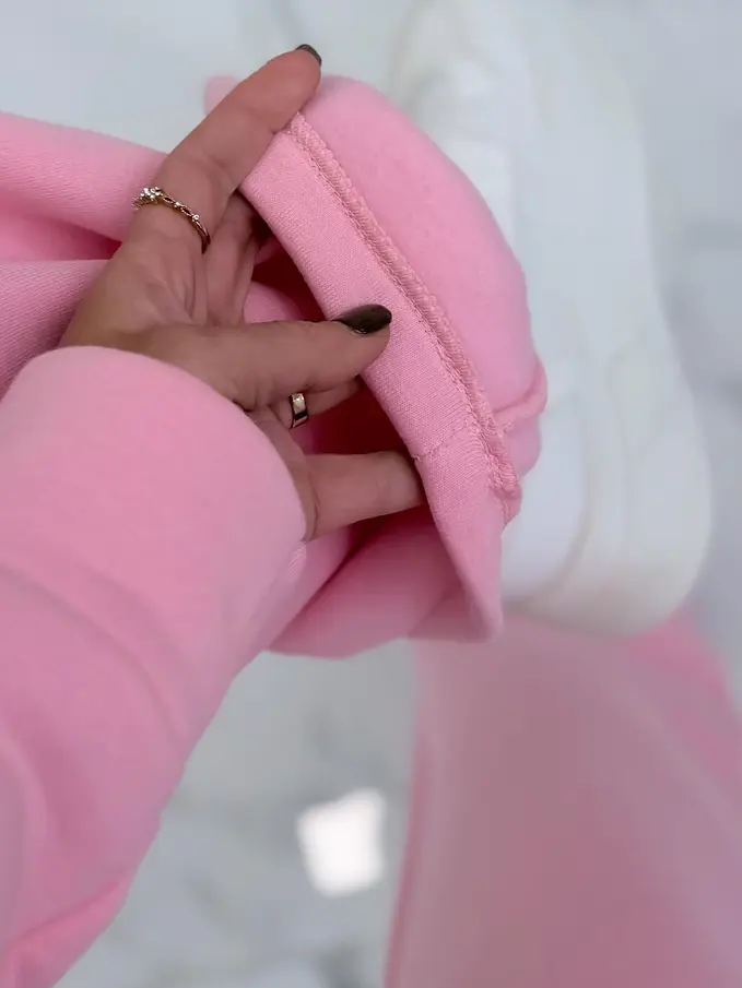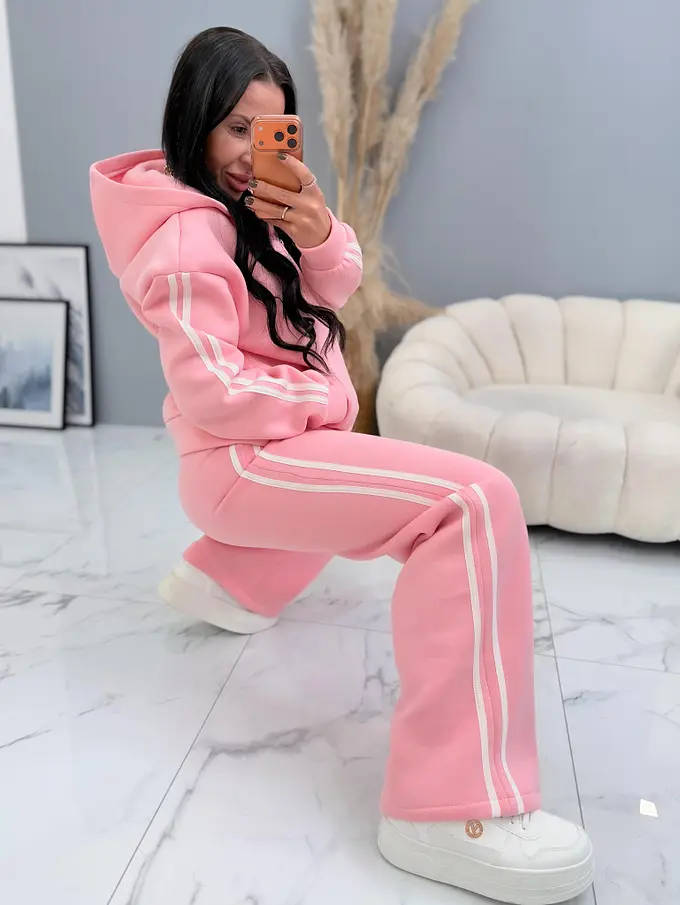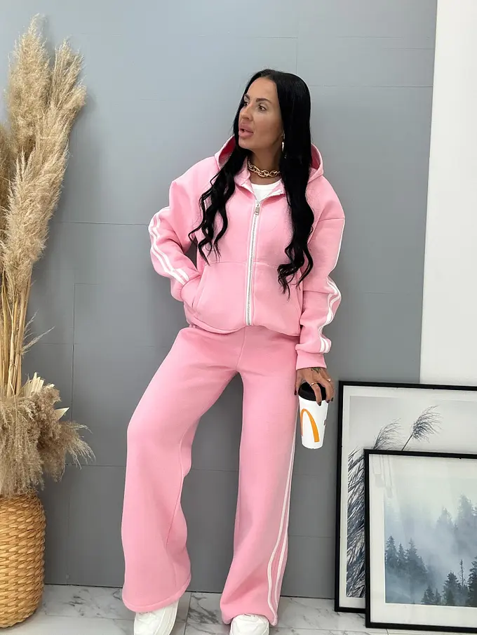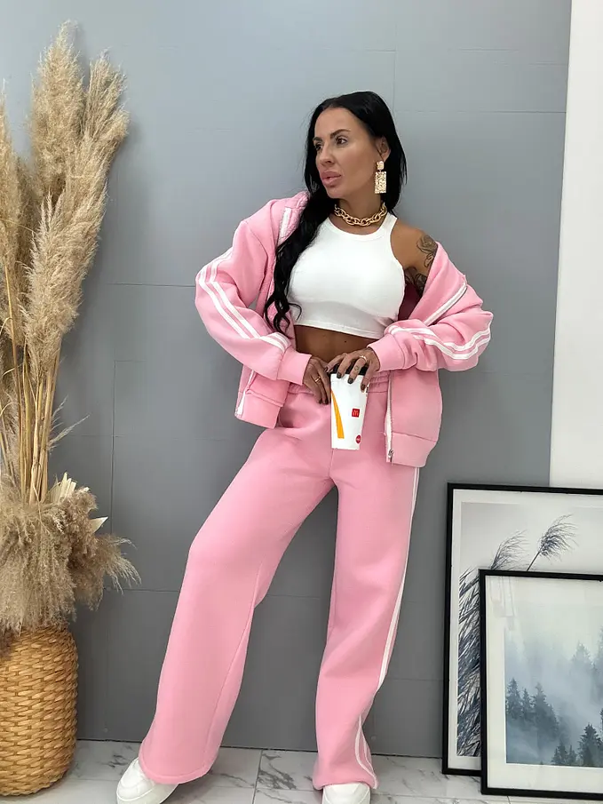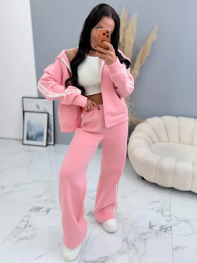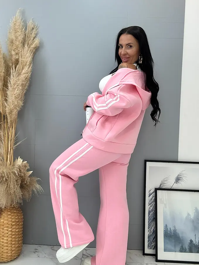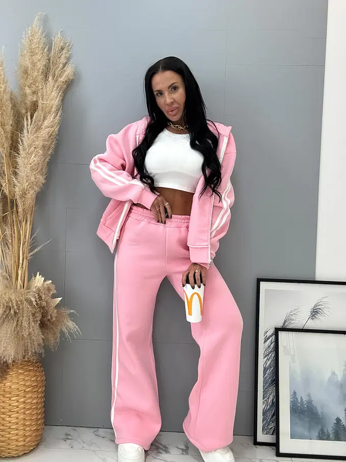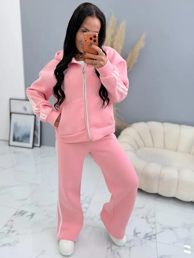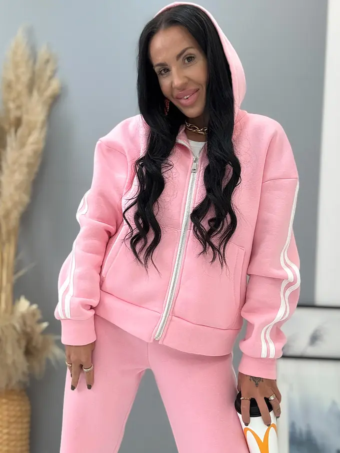 Dámsky komplet z novej kolekcie. Pozostáva z mikiny a nohavíc. Nohavice majú gumený pás Materiál je príjemný, zateplený, elastický. Mikina so striborným zipsom a vreckami na prednej strane.